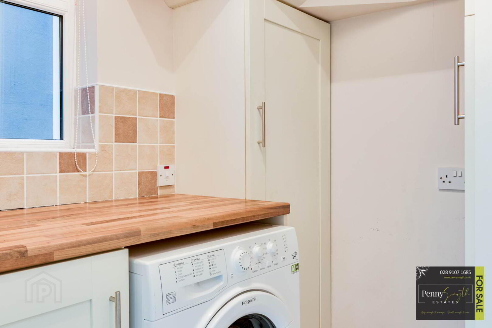 Low level unit with worktop & recess for washing machine. Ironing board cupboard. Housed Gas boiler. uPVC double glazed window, extractor fan, mounted electrical consumer unit, wall tile at unit, single radiator with thermostatic valve & ceramic tile flooring.