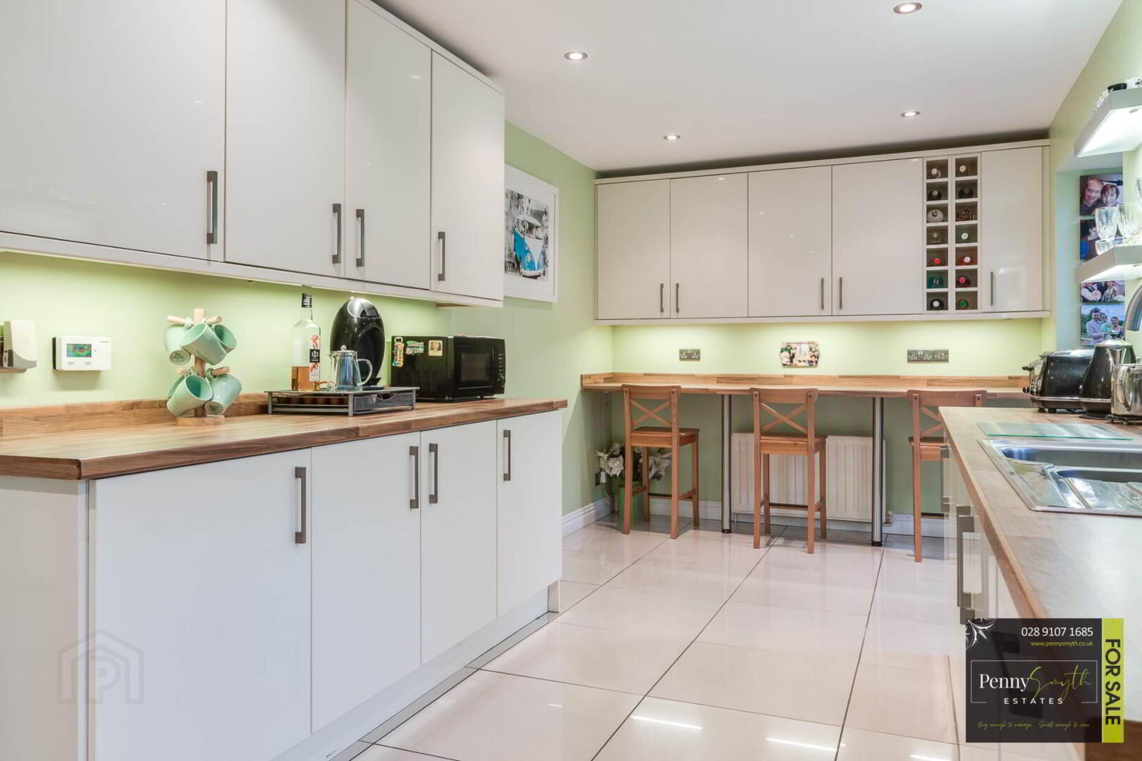 Fitted kitchen with a range of high & low level units with breakfast bar & under counter lighting. 1½ bowl stainless steel sink unit with side drainer & mixer tap. Integrated under counter fridges, large capacity electric oven with gas hob & extractor canopy over. Recessed lighting, double radiator & Porcelain tiled flooring.