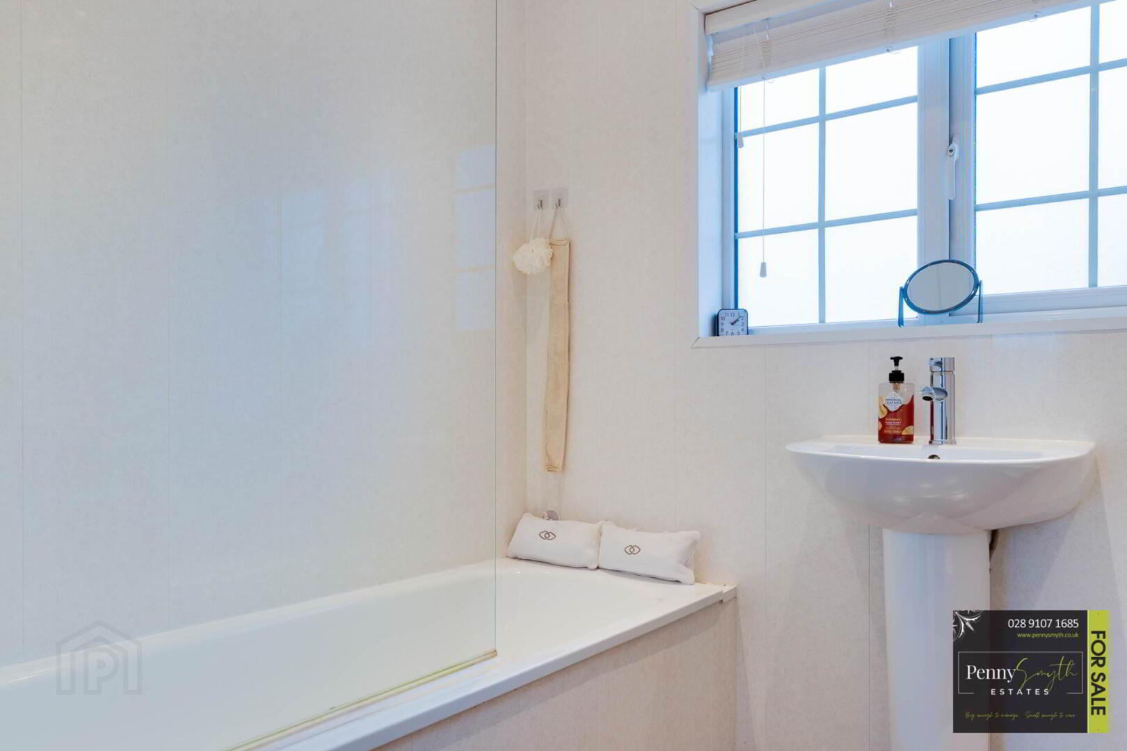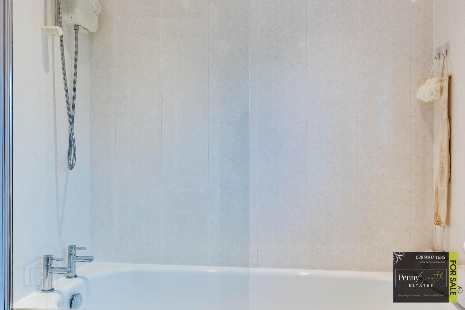 Three piece white suite comprising panelled bath with pillar taps & Triton` electric shower over. Pedestal wash hand basin with mixer taps & closed coupled w.c. uPVC frosted double glazed window, recessed lighting, Wet Wall panelling, vertical heated towel rail & ceramic tiled flooring.