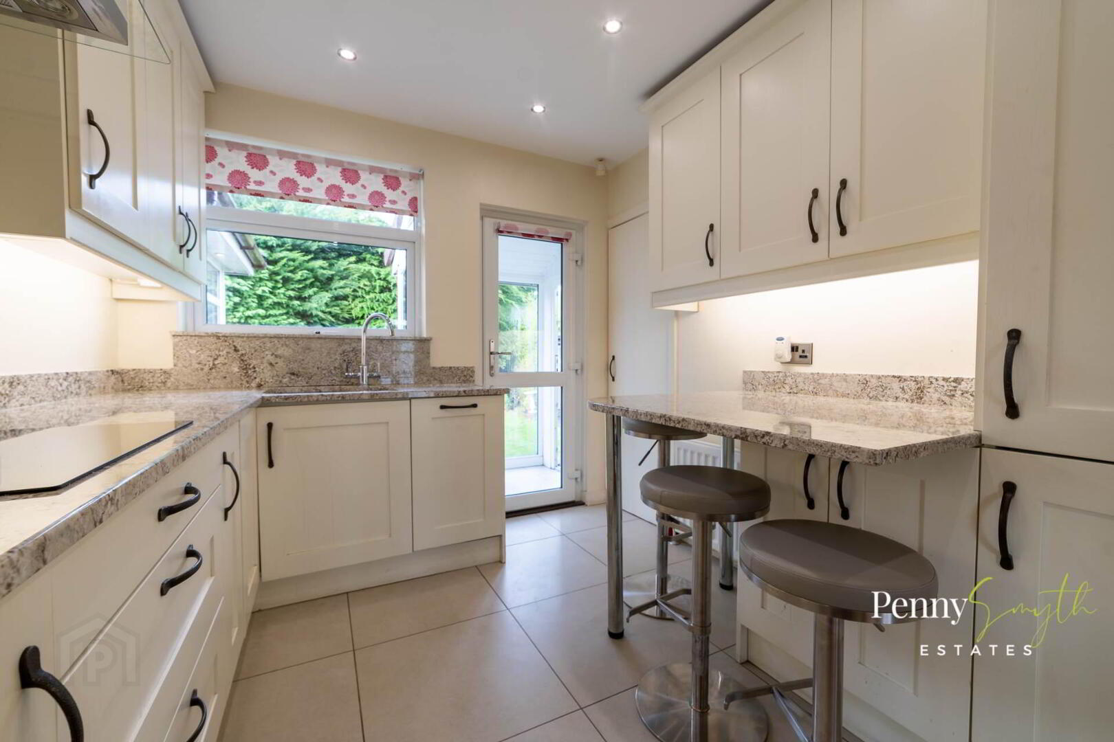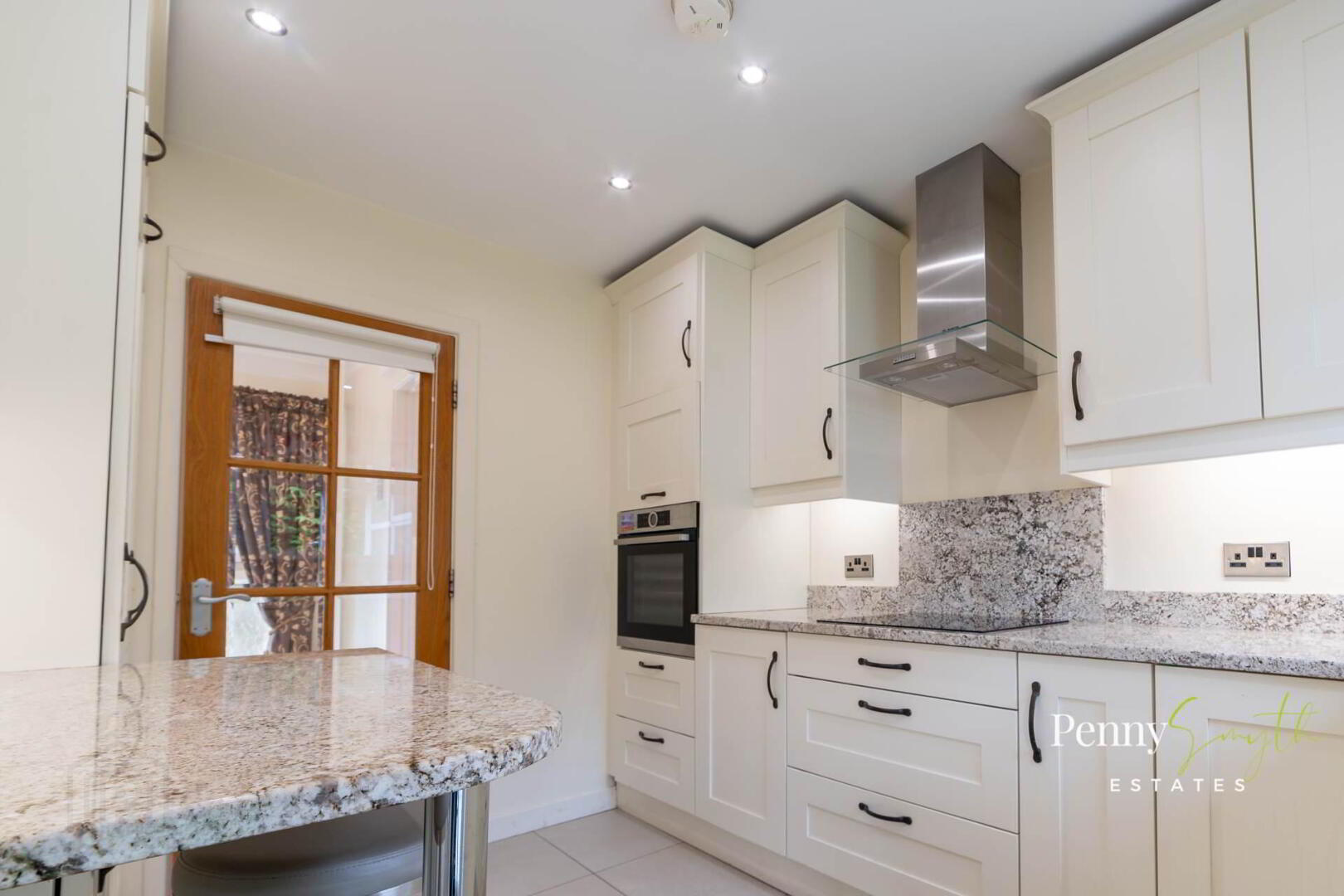 A modern fitted kitchen with a range of high & low level units, breakfast bar & polished Granite work tops. Recessed 1½ bowl stainless steel sink unit with Gooseneck mixer tap. Integrated electric oven & four ring ceramic hob with stainless steel extractor over, integrated fridge freezer & dishwasher. Built in pantry with shelving. uPVC external rear door with double glazed inserts, uPVC double glazed window, recessed lighting, double radiator with thermostatic valve & ceramic tiled flooring.