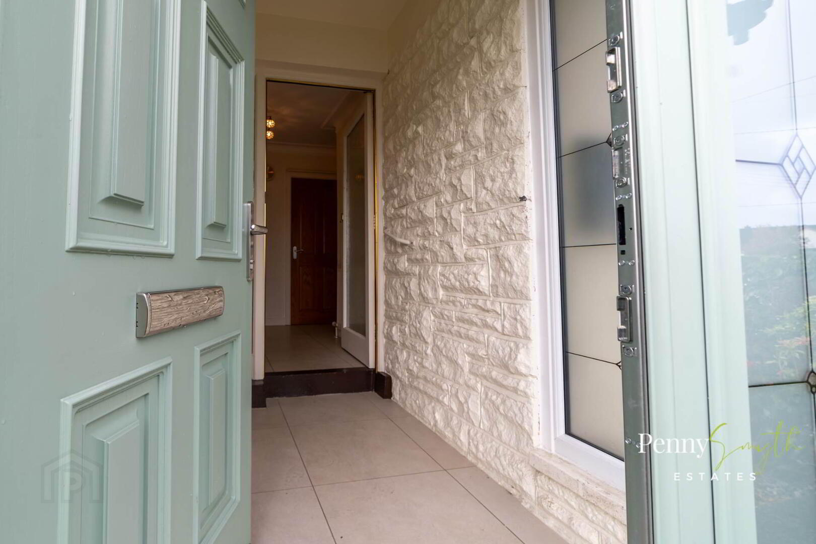 Composite external front door with uPVC double glazed side panel with privacy glass & ceramic tilled flooring.