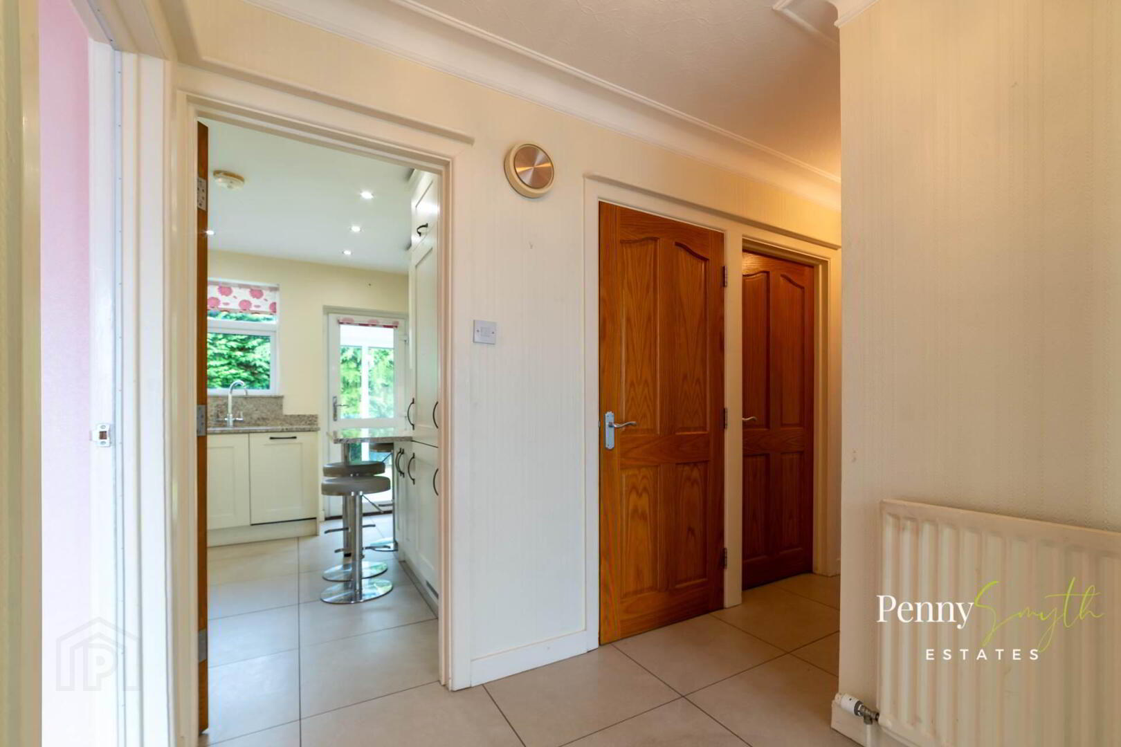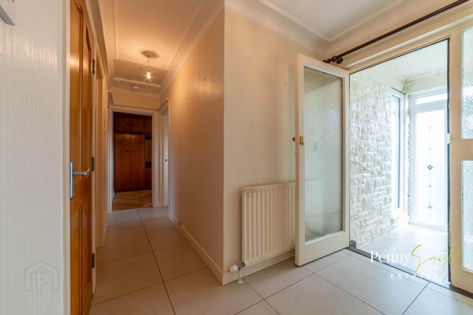Cloakroom with hanging & shelving, mounted security alarm panel & mounted heating controller. Access to roof space. Single radiator with thermostatic valve & ceramic tiled flooring