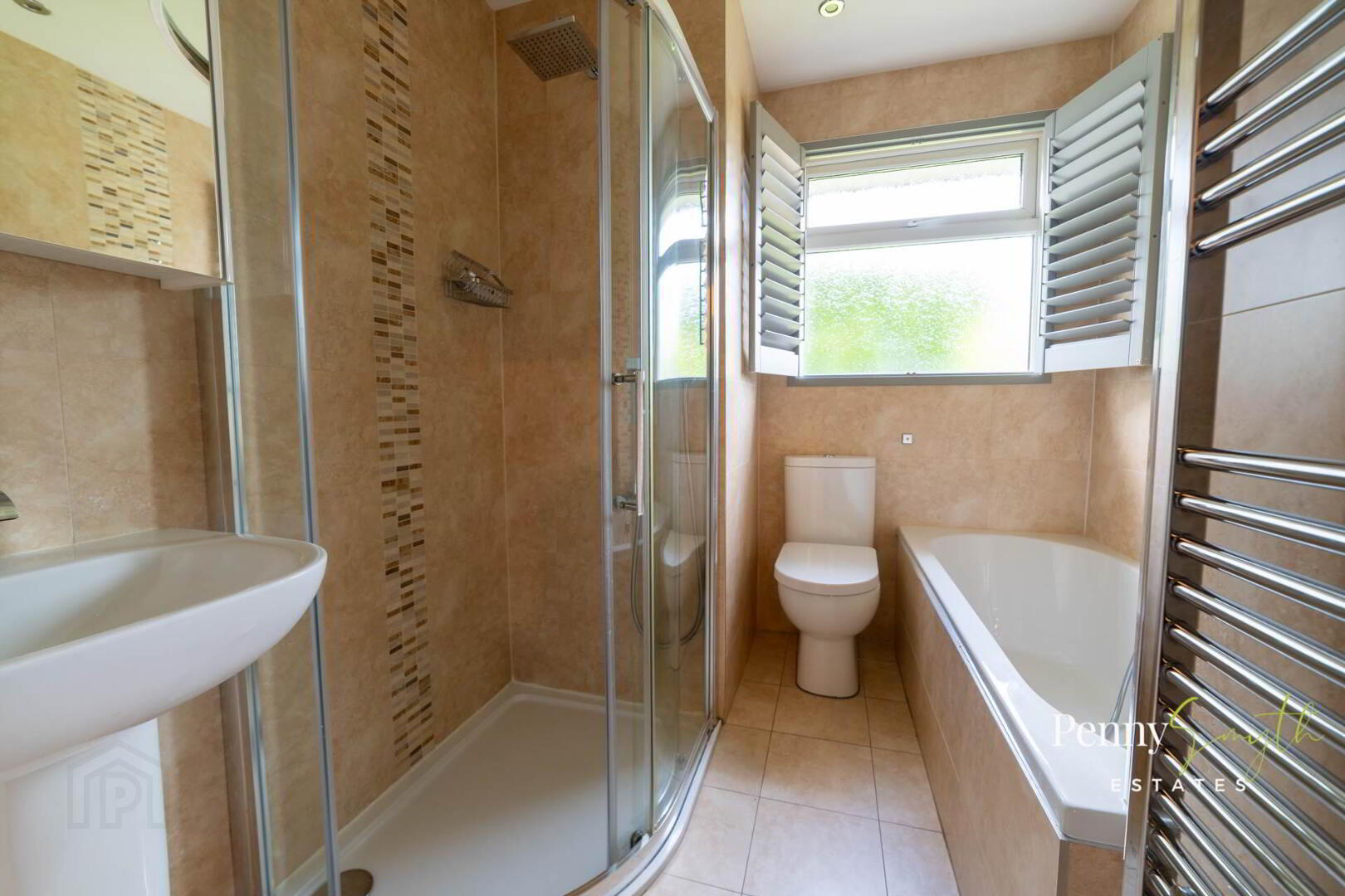 Four piece white bathroom suite comprising panelled bath with telephone hand shower & mixer tap. Shower cubicle with thermostatically controlled rain fall shower head & telephone hand shower. Semi pedestal wash hand basin with mixer tap & close couple wc. Airing cupboard housing foam insulated hot water cylinder & airing shelves, wall mounted solar panel controller. uPVC double glazed frosted window, motion sensored recessed lighting, walls fully tiled., vertical heated towel rail & ceramic tiled flooring.