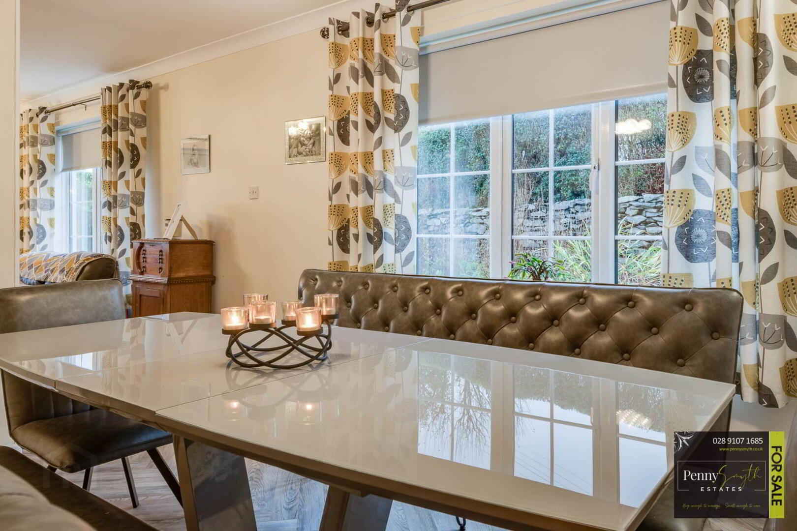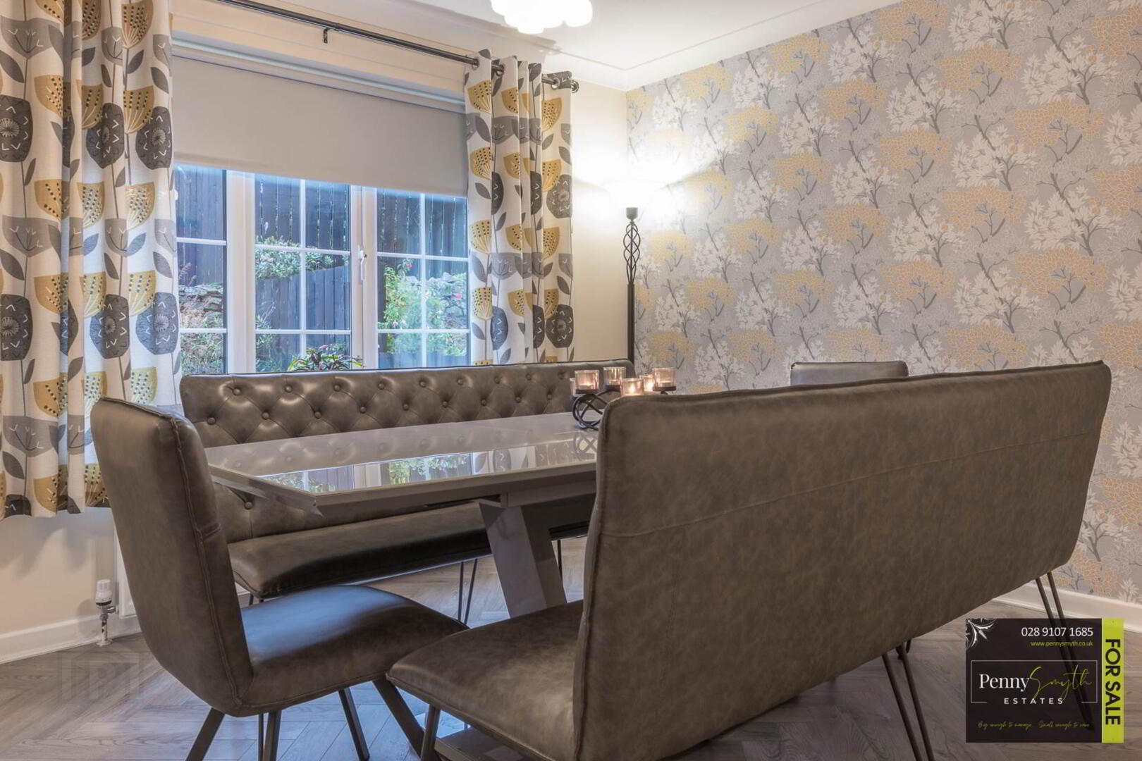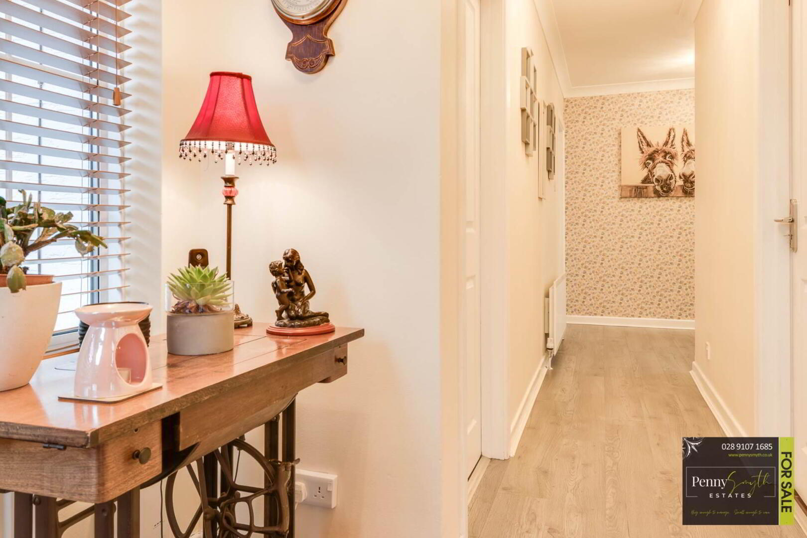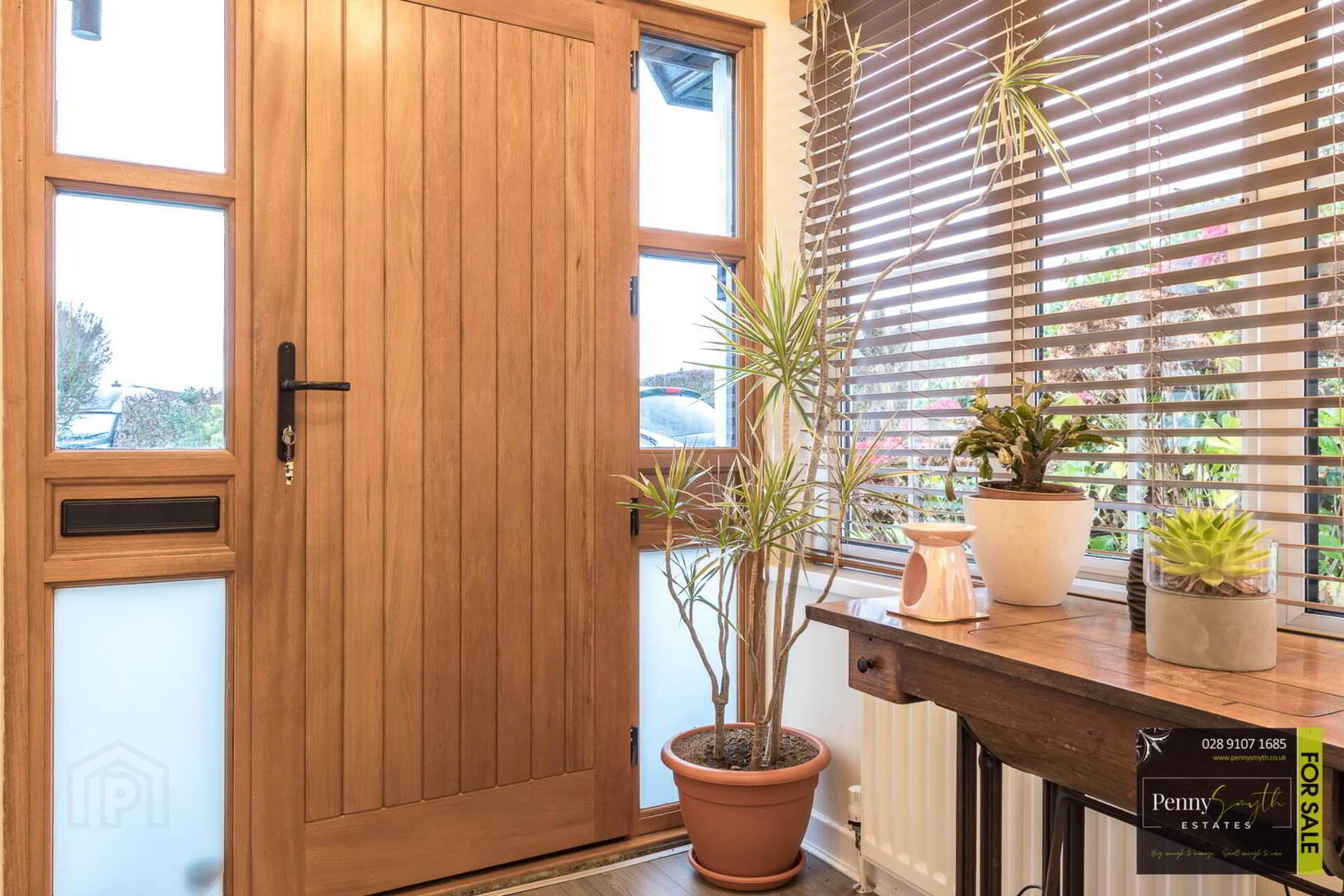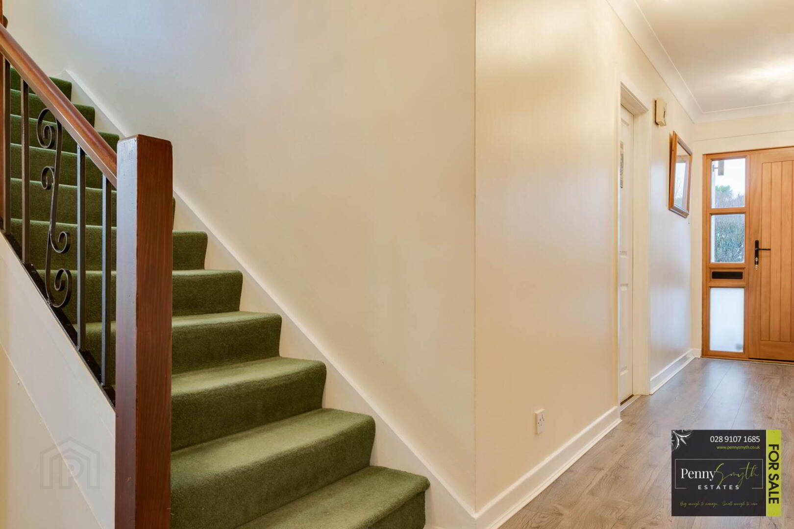 Timber external front door with double glazed side panels. uPVC double glazed window, two single radiators, ceiling cornice & laminate wood flooring.