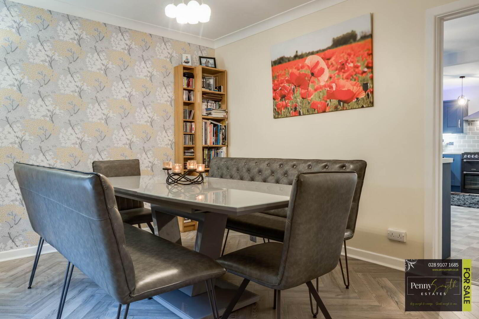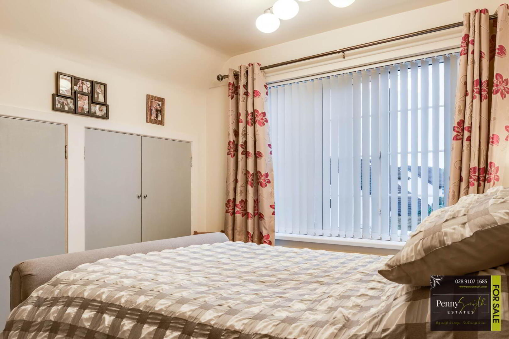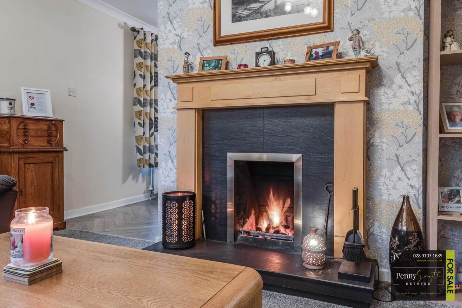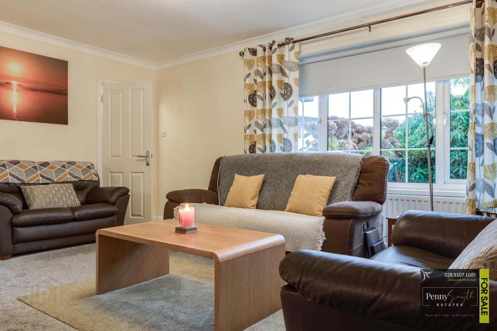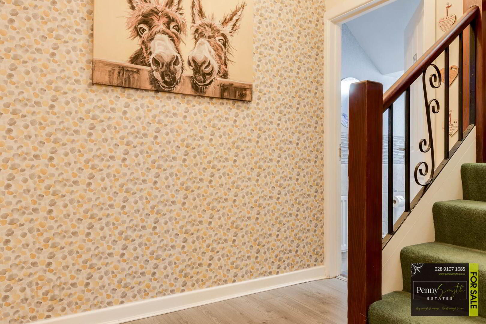 Timber external front door with double glazed side panels. uPVC double glazed window, two single radiators, ceiling cornice & laminate wood flooring.