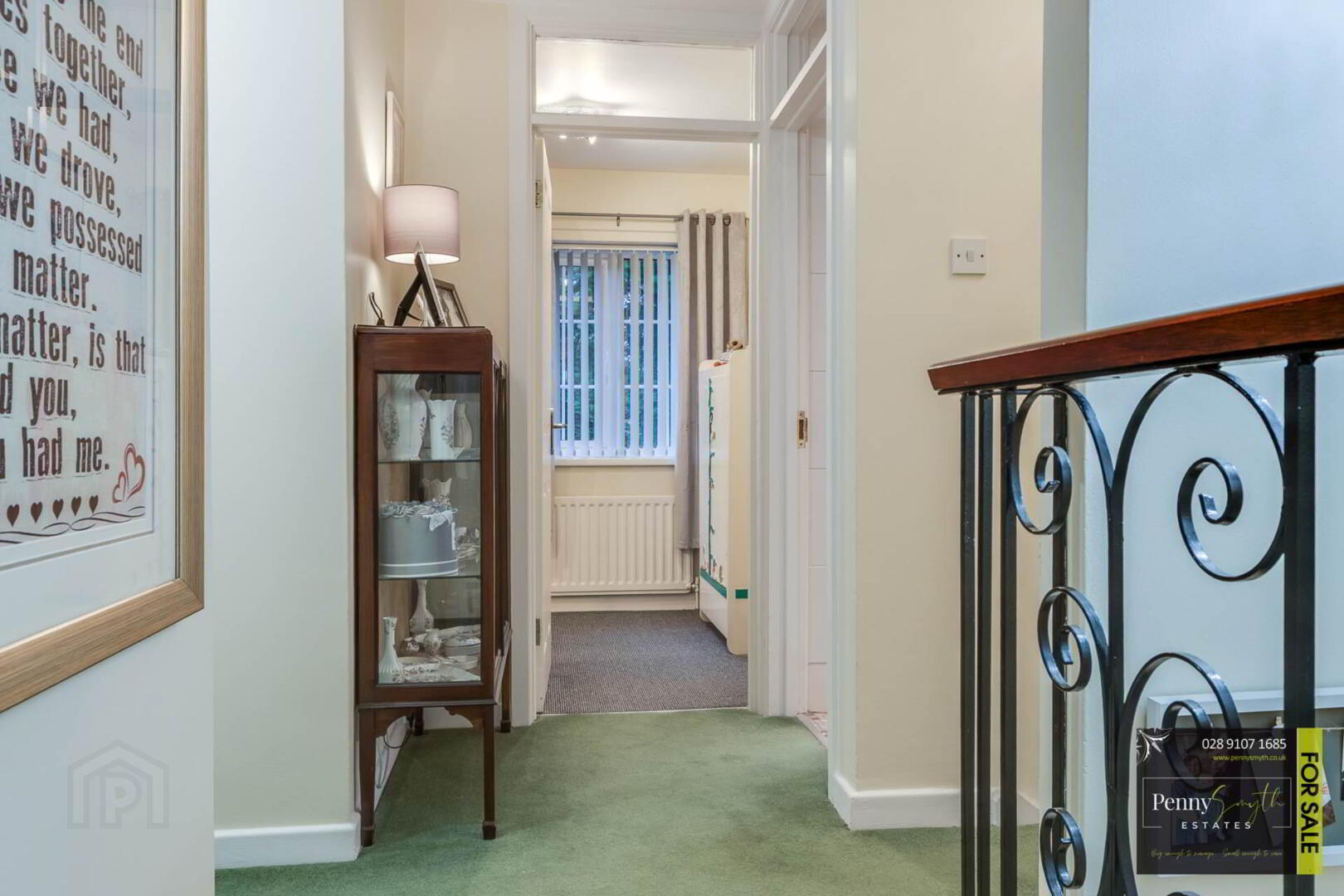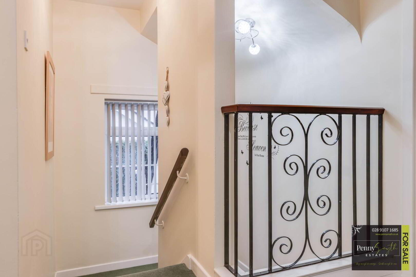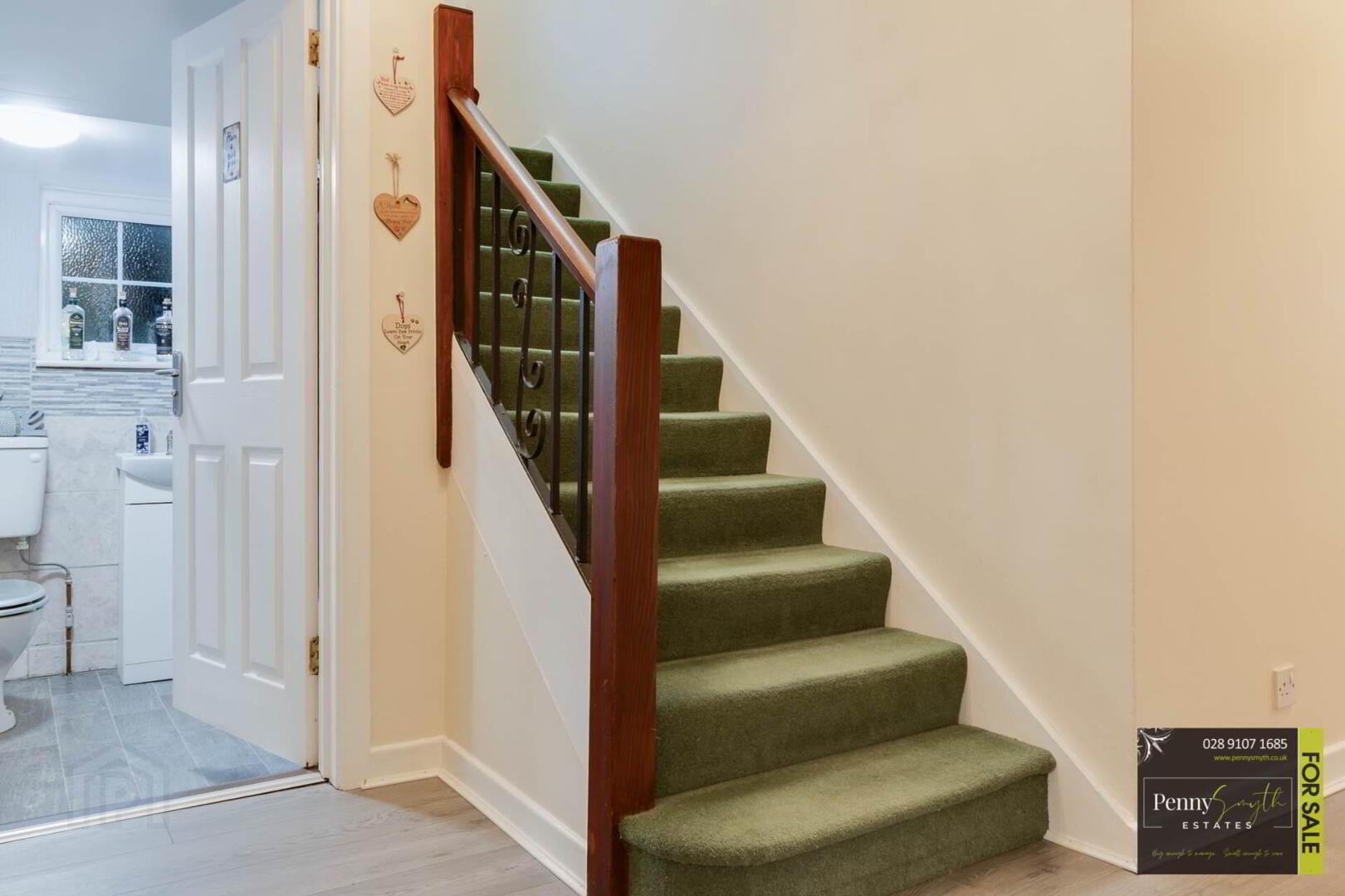 Open staircase with cast iron spindles, uPVC double glazed window & carpeted flooring.
