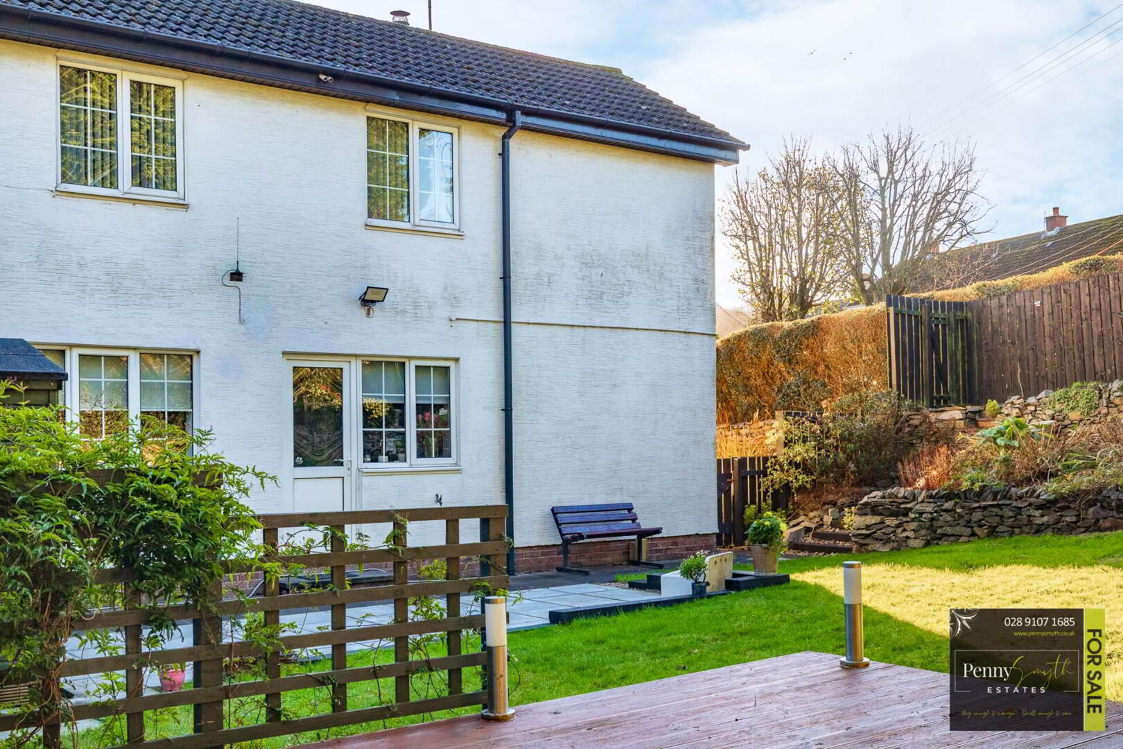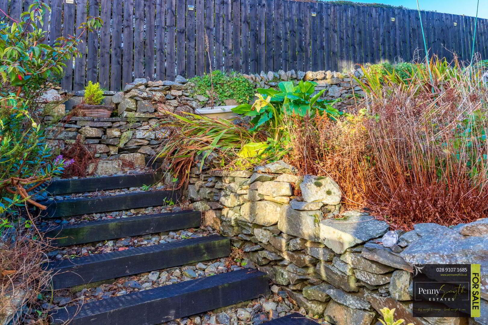 Private & enclosed by fencing with gated access. Garden laid in lawn with a stoned rockery, step stair climb landscaped with raised flowerbeds. Outside water tap & lighting. PVC oil tank.