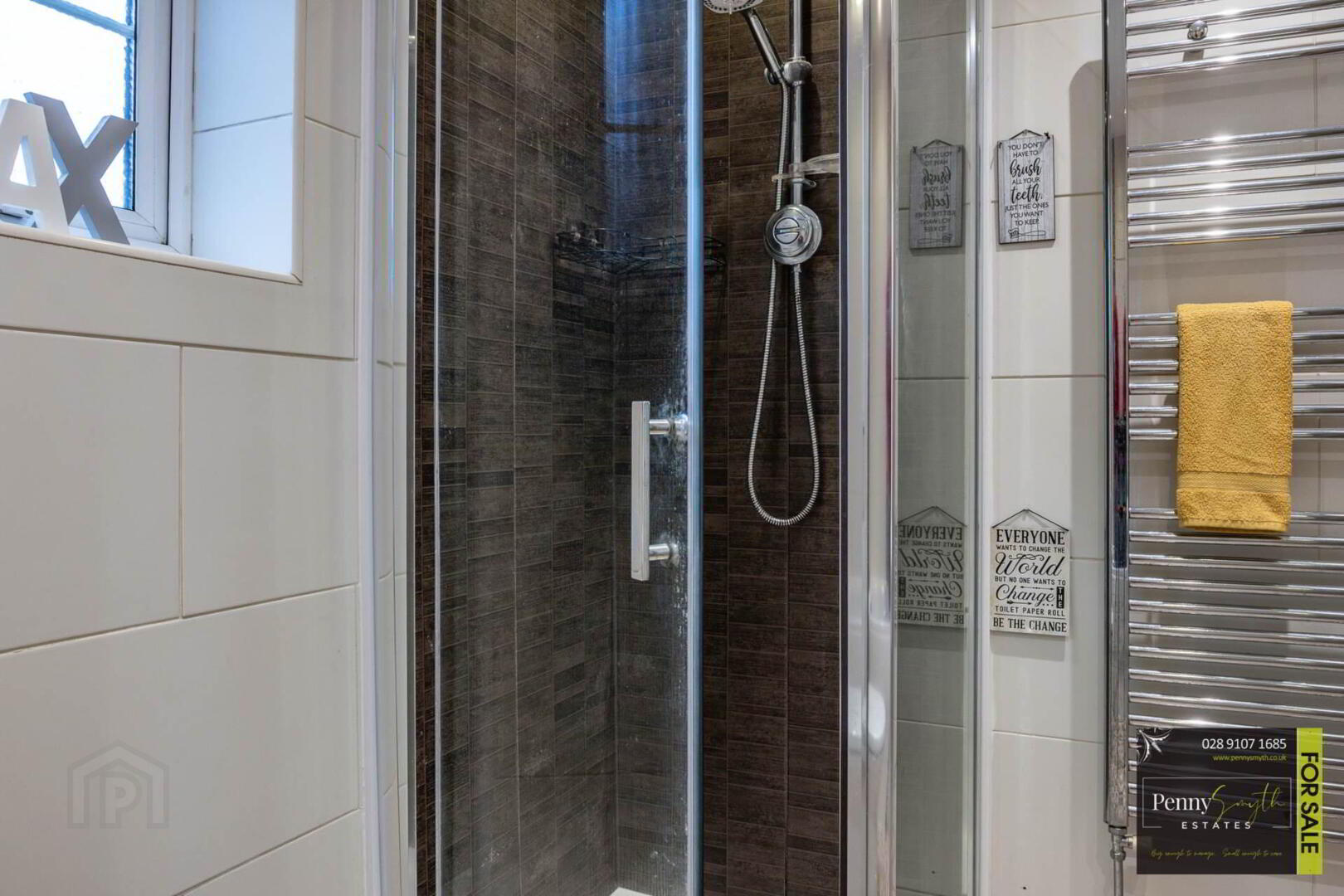 Corner shower quadrant, wet wall panelled with thermostatically controlled power shower. Wall mounted wash hand basin, concealed cistern with wall hung w.c. & extractor fan. Heated towel rail, fully tiled walls & grey tiled floor. Access into eaves.