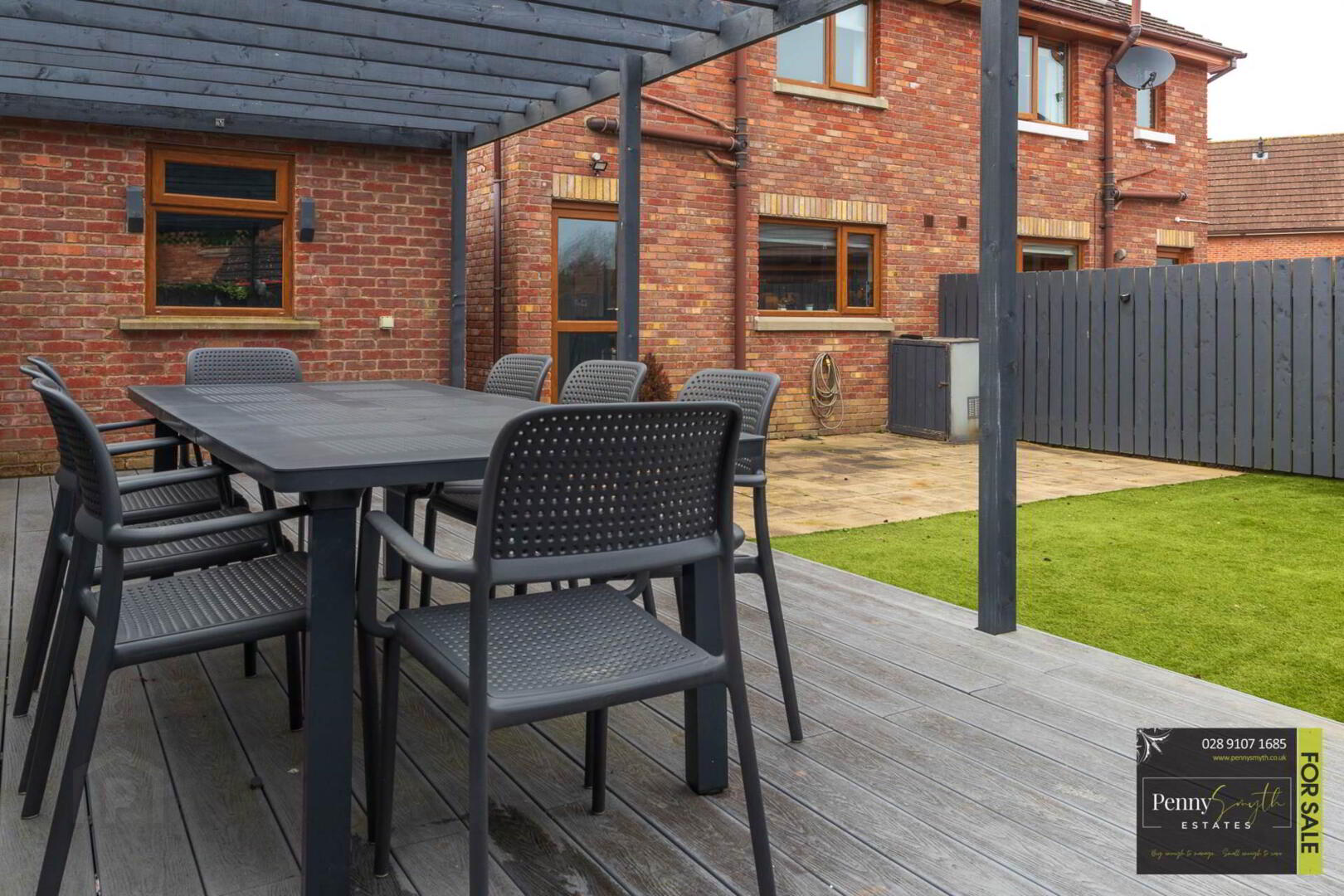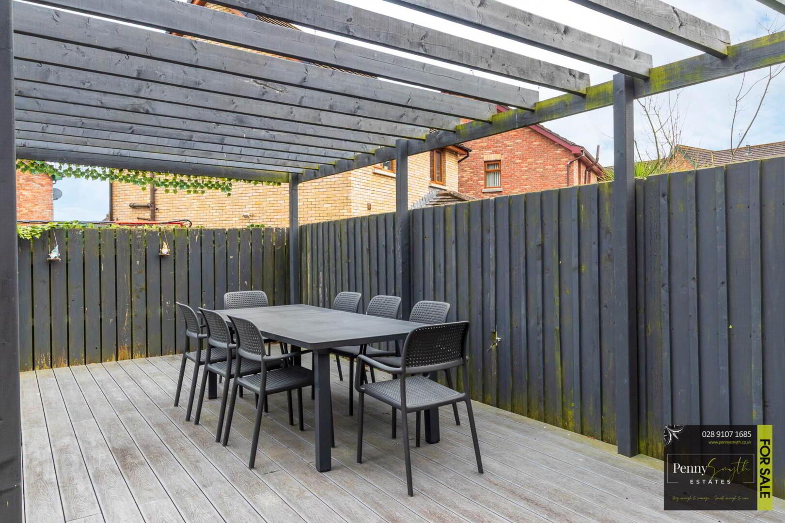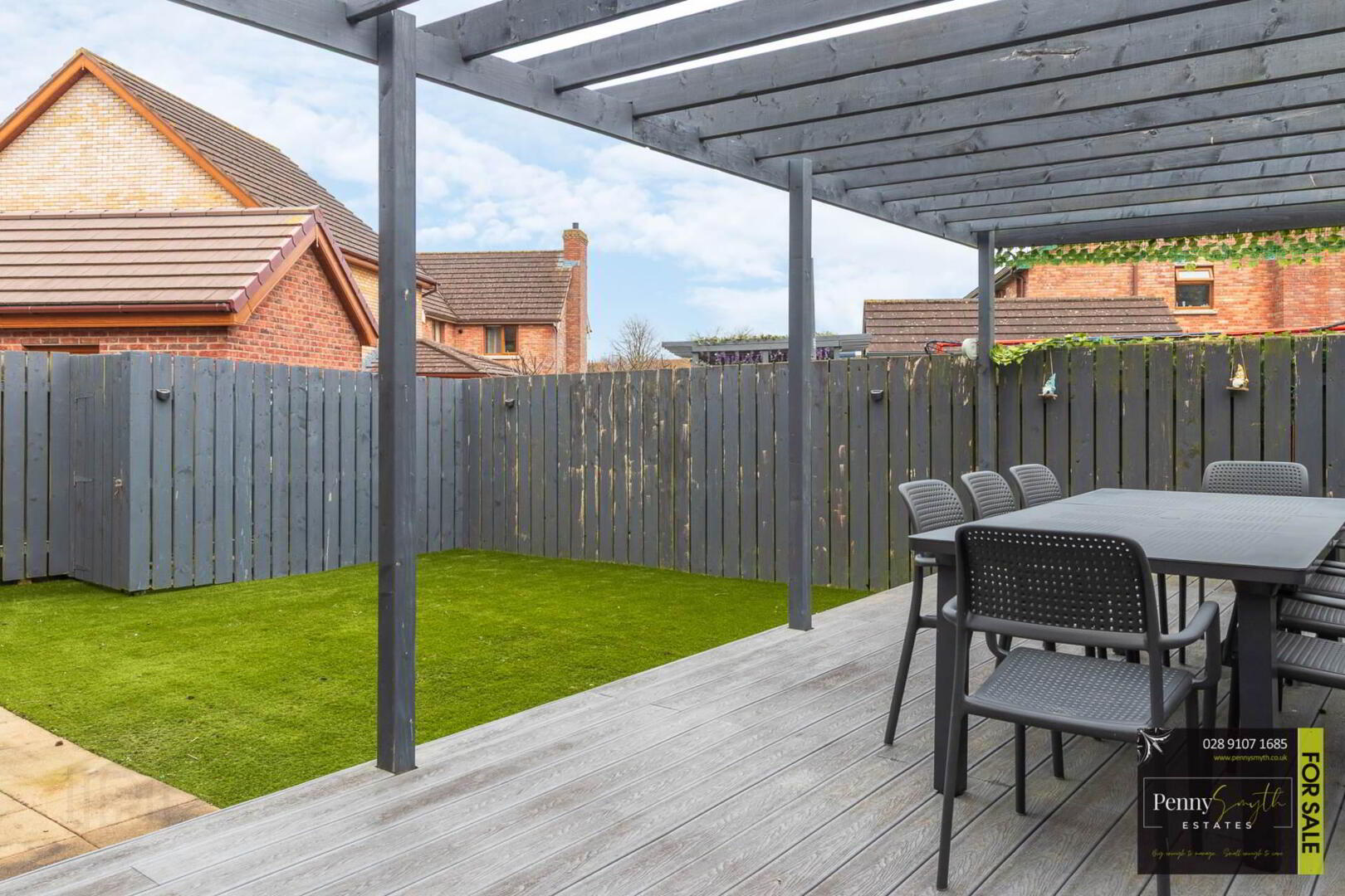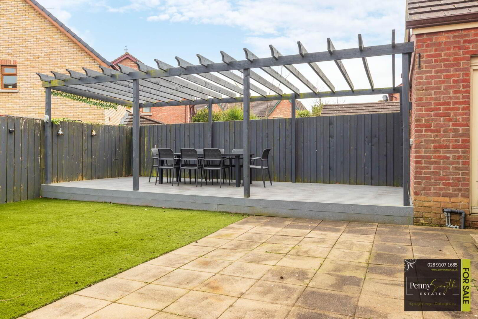 Fully enclosed by fencing with gated access. Part patio & part laid in artificial lawn part raised decked are perfect for entertaining. Oil fired boiler, PVC oil tank. Outside light & water tap.