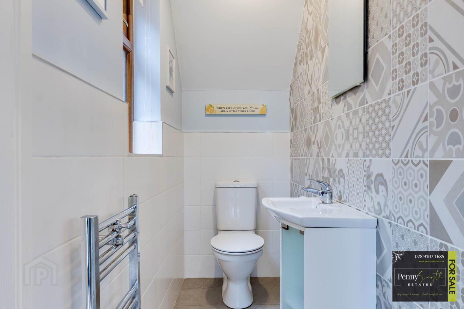 Comprising vanity wash hand basin & close couple w.c. uPVC oak effect double glazed frosted window, vertical heated towel rail & ceramic tiled flooring.