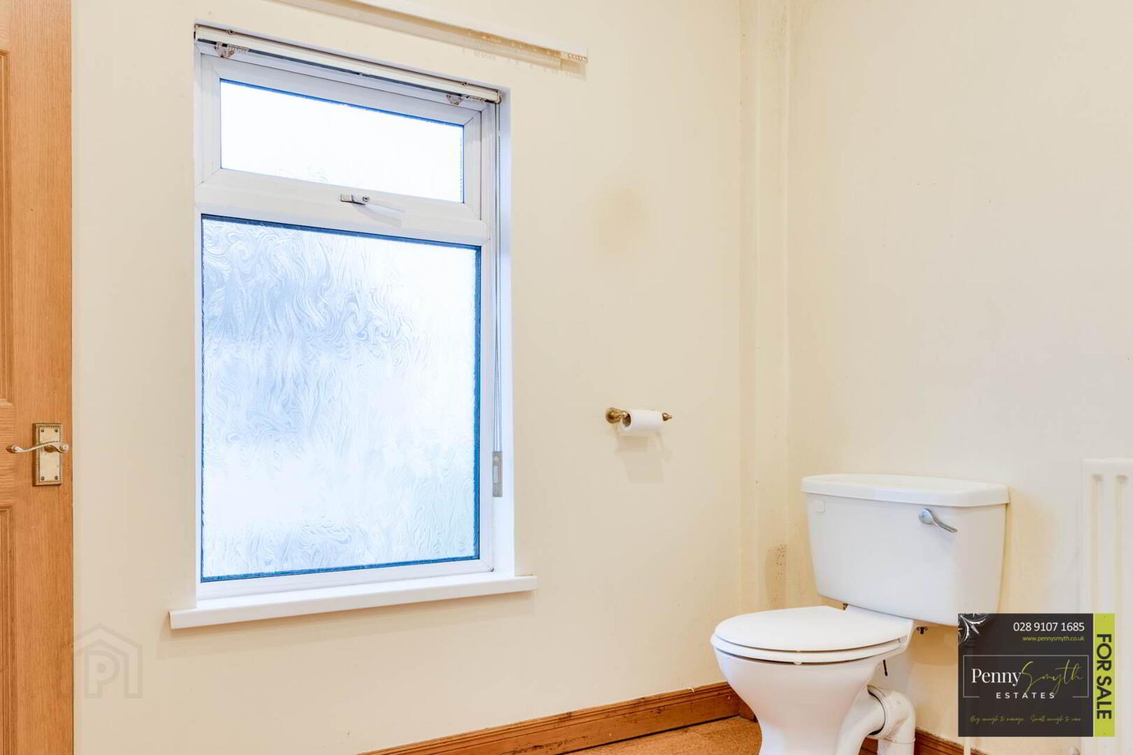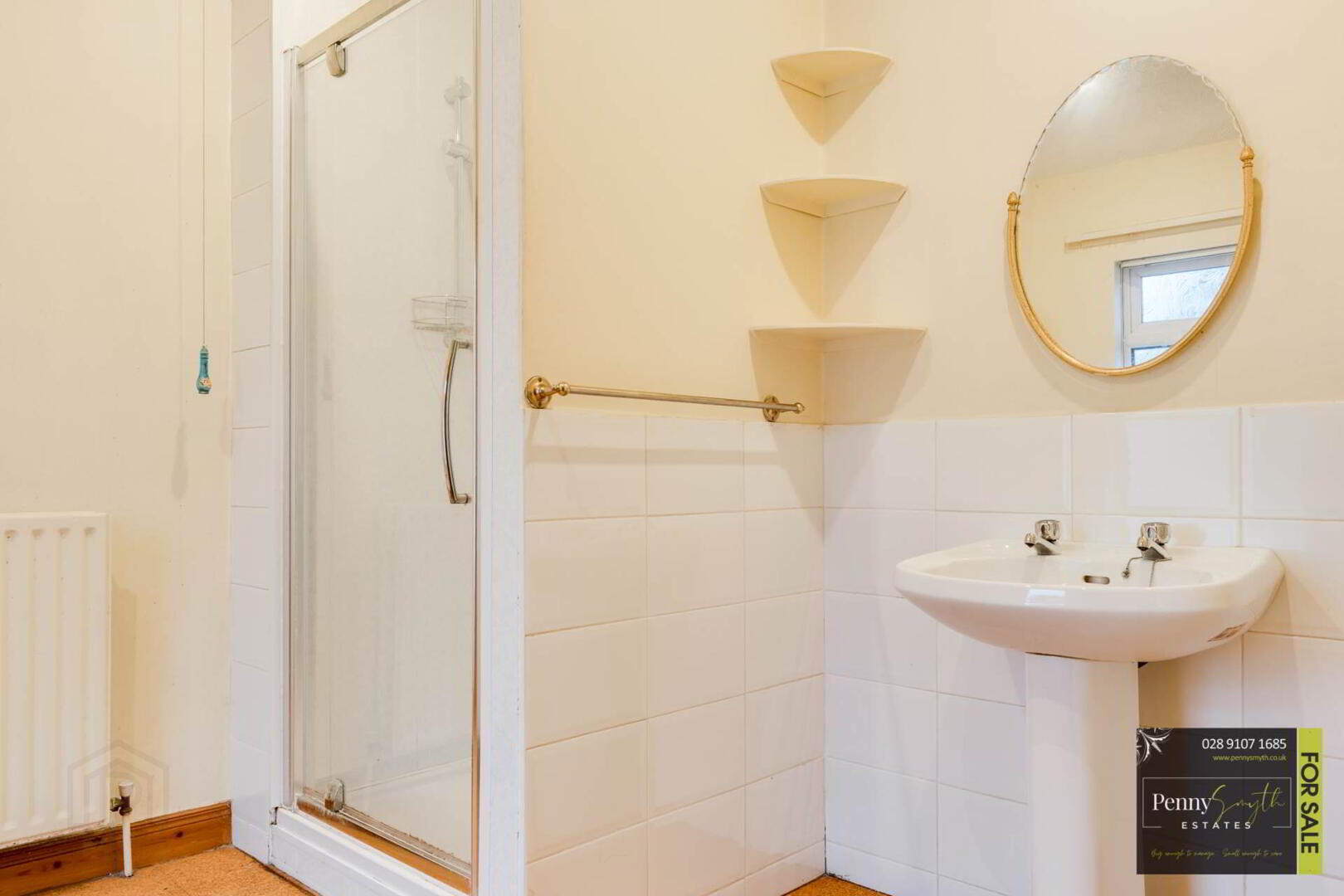 White suite comprising wet wall panelled shower enclosure with electric shower. Pedestal wash hand basin with pillar taps & low flush w.c. uPVC double glazed frosted window, double radiator & tile effect flooring. Access to roof space.