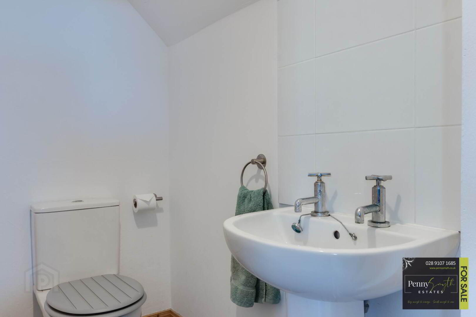 Comprising pedestal wash hand basin with pillar taps & tiled splash back. Close couple w.c. Single radiator and Vinyl flooring.