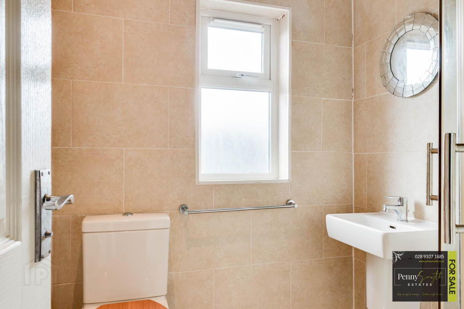 Three piece white suite comprising corner shower enclosure with thermostatic mixer shower over. Semi pedestal wash hand basin with mixer tap & close couple w.c. uPVC double glazed privacy window, walls fully tiled, recessed lighting, extractor fan, single radiator with thermostatic valve & ceramic tile flooring. Access to roof space.