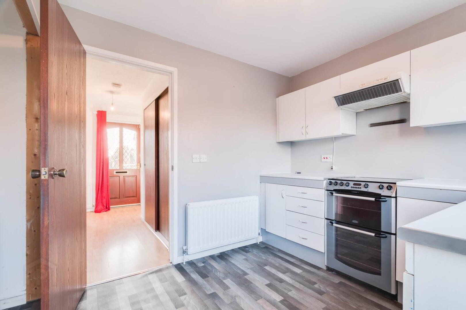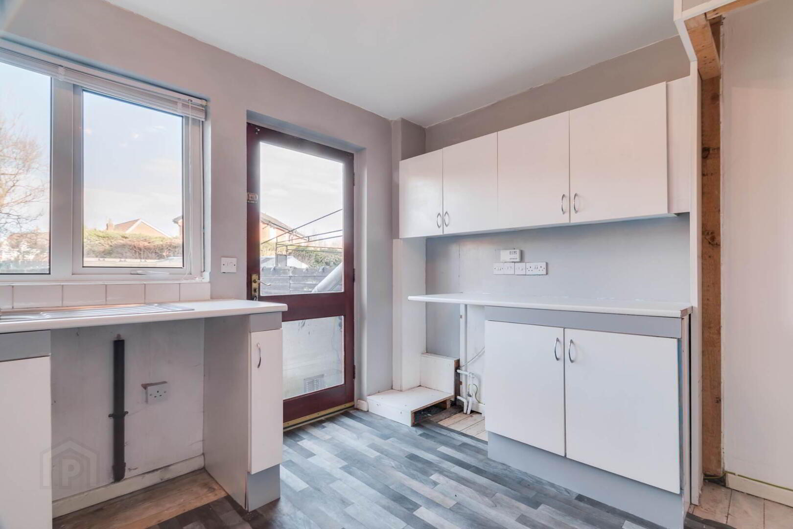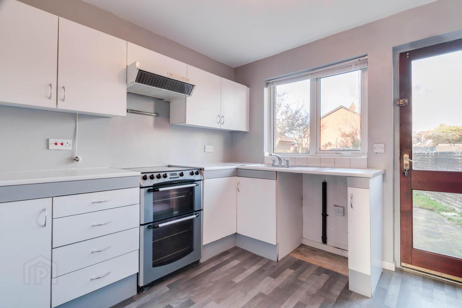 Fitted kitchen, comprising a range of high & low level units. Stainless steel sink unit & side drainer with Gooseneck mixer tap. Recessed for cooker with stainless steel extractor canopy over. Recessed for fridge freezer, washing machine & tumble dryer. uPVC double glazed external rear door & window, double radiator & laminate wood flooring.