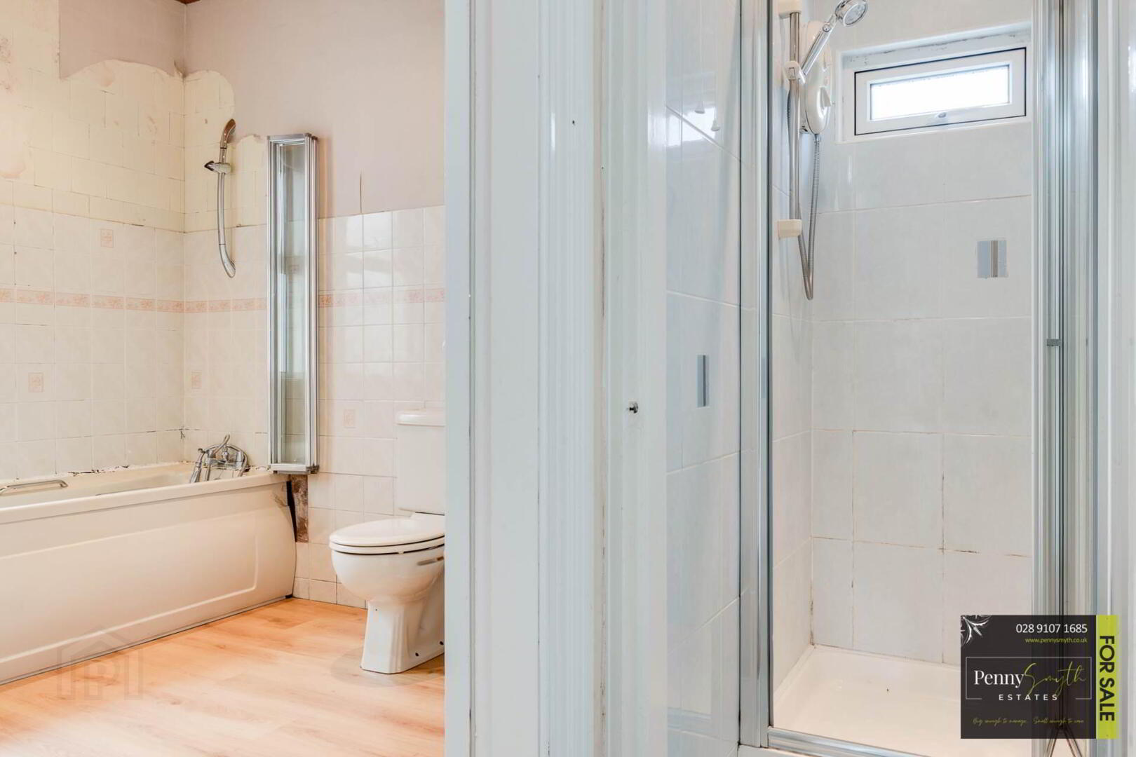 Comprising shower cubicle with Mira electric shower. uPVC double glazed frosted window, recessed lighting, extractor fan, walls fully tiled & ceramic tiled flooring.