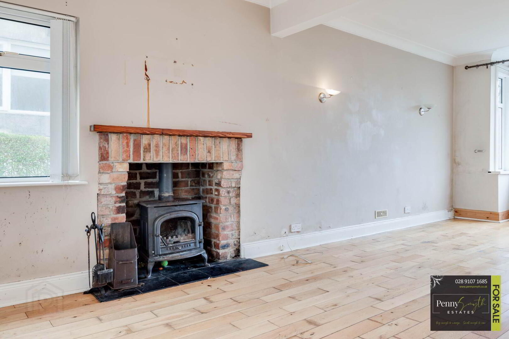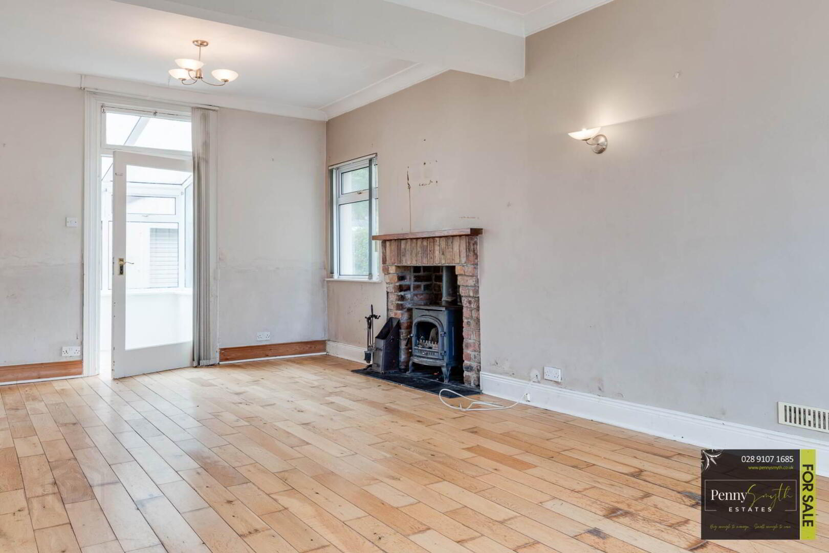 Feature multi fuel burning stove with red brick surround, wooden mantelpiece & tiled hearth. uPVC double glazed Bay window, double radiators with thermostatic valve, wall lighting & solid wood flooring