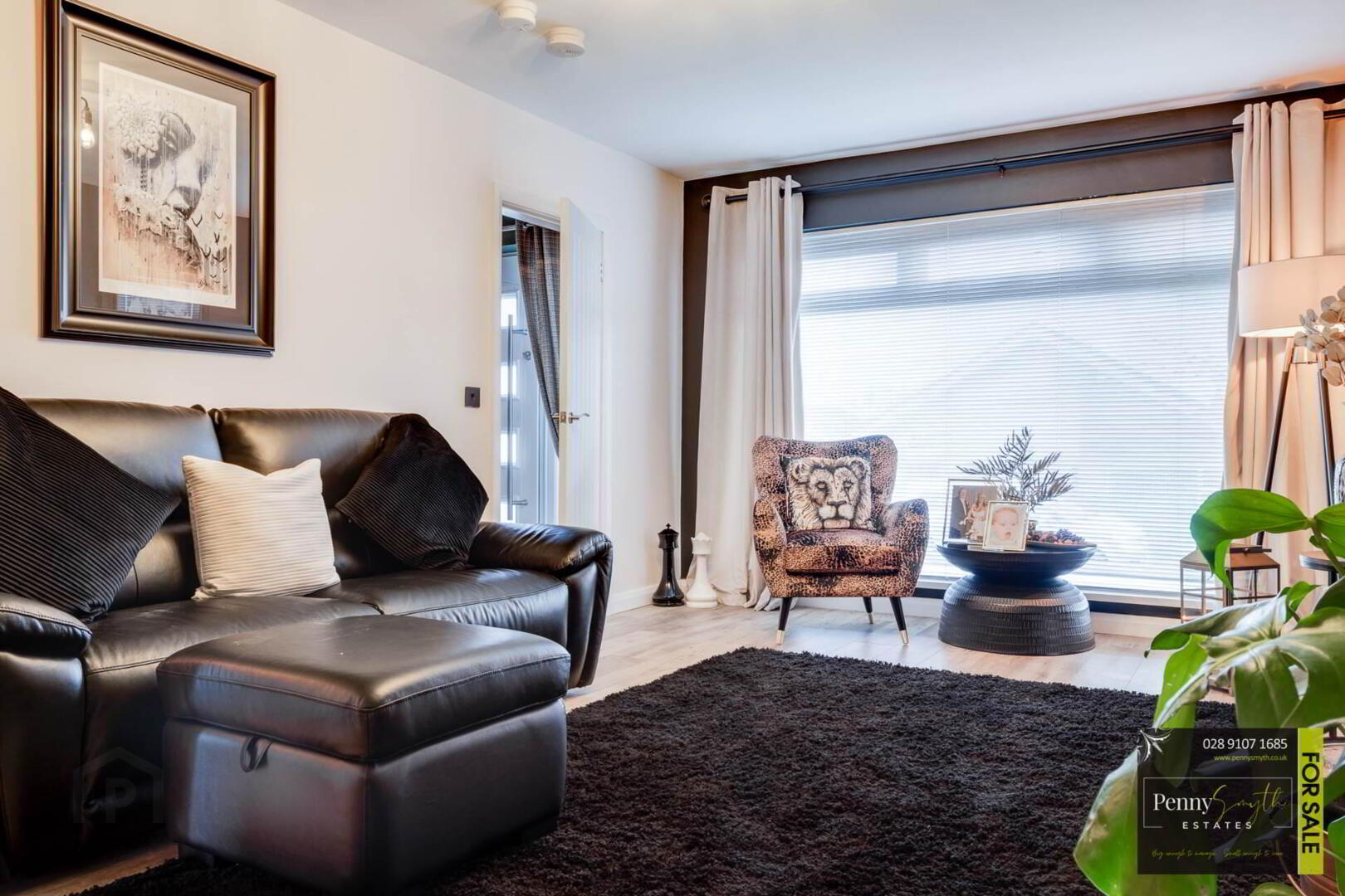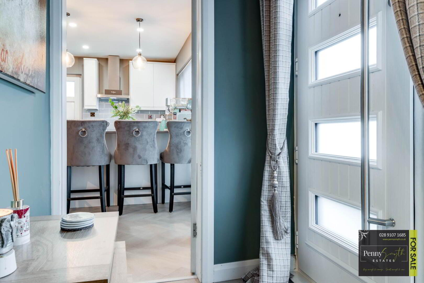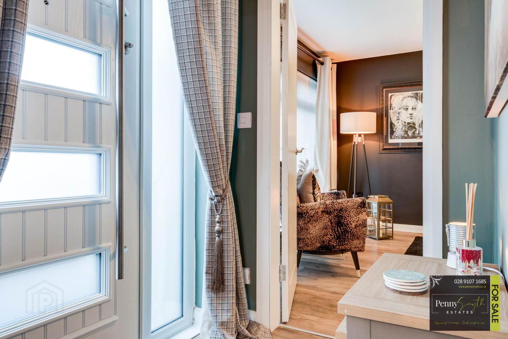 Composite slam shut external front door with easy access lock & satin privacy glass side panel. Laminate wood flooring.