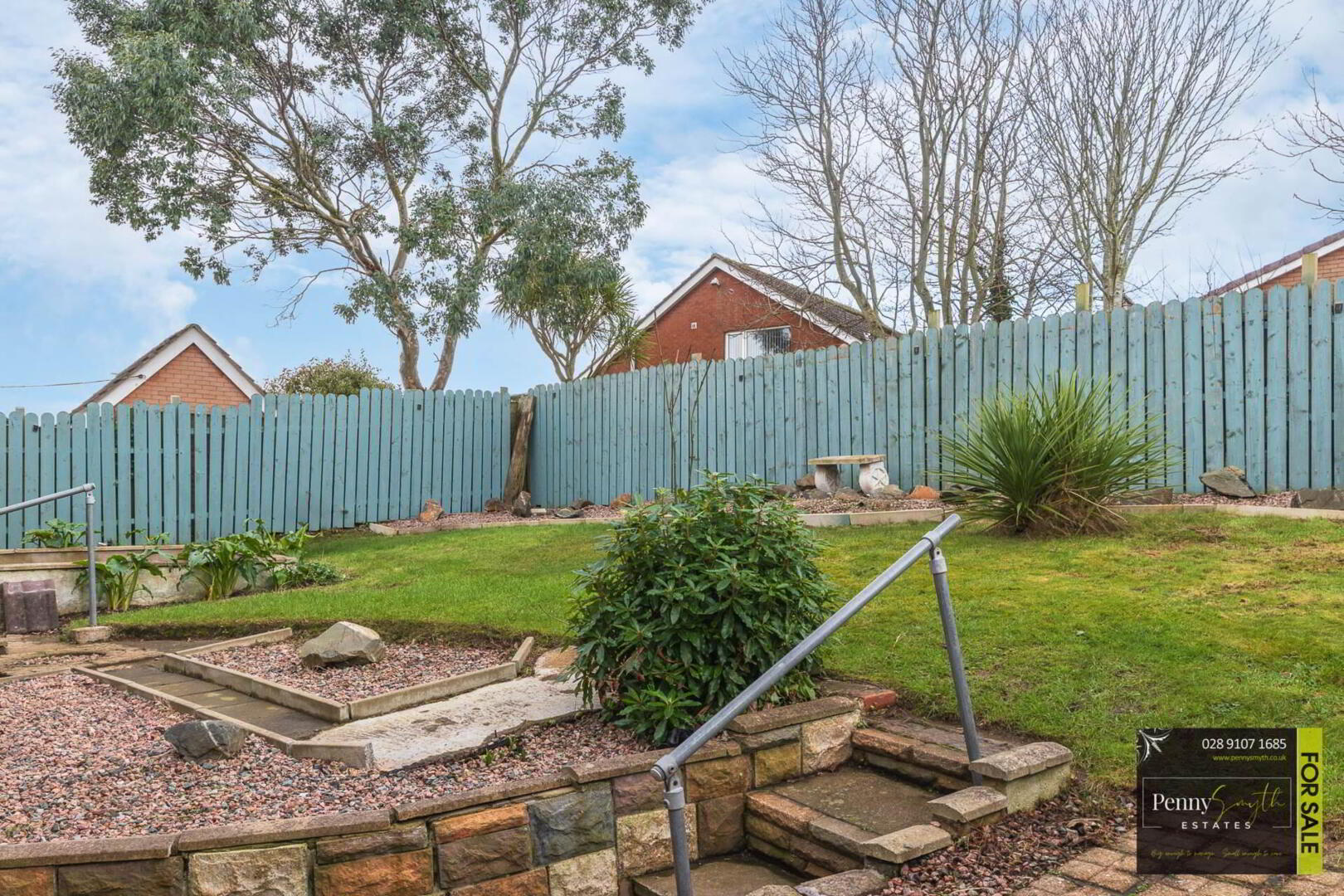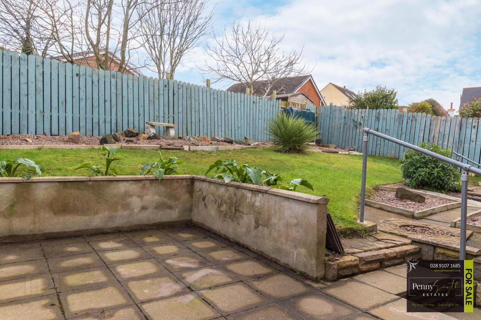 Concrete drive way. Garden wall & garden laid in lawn. Outside electric & water tap.