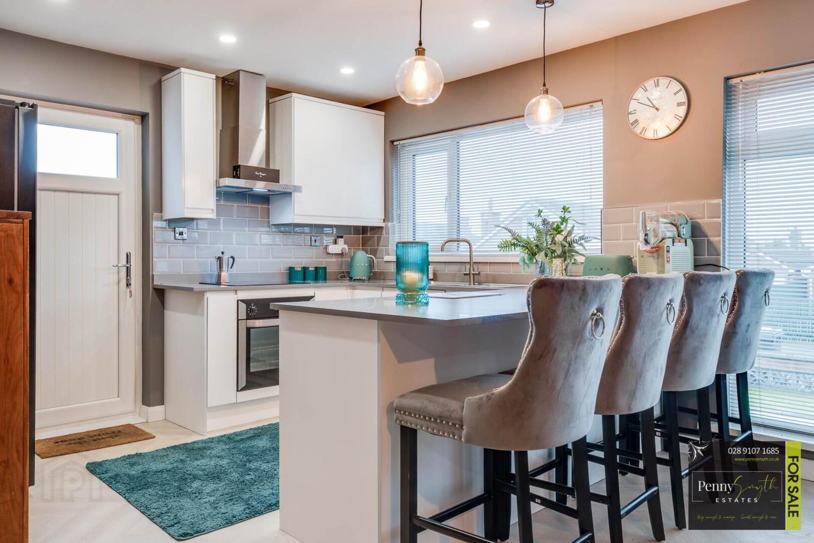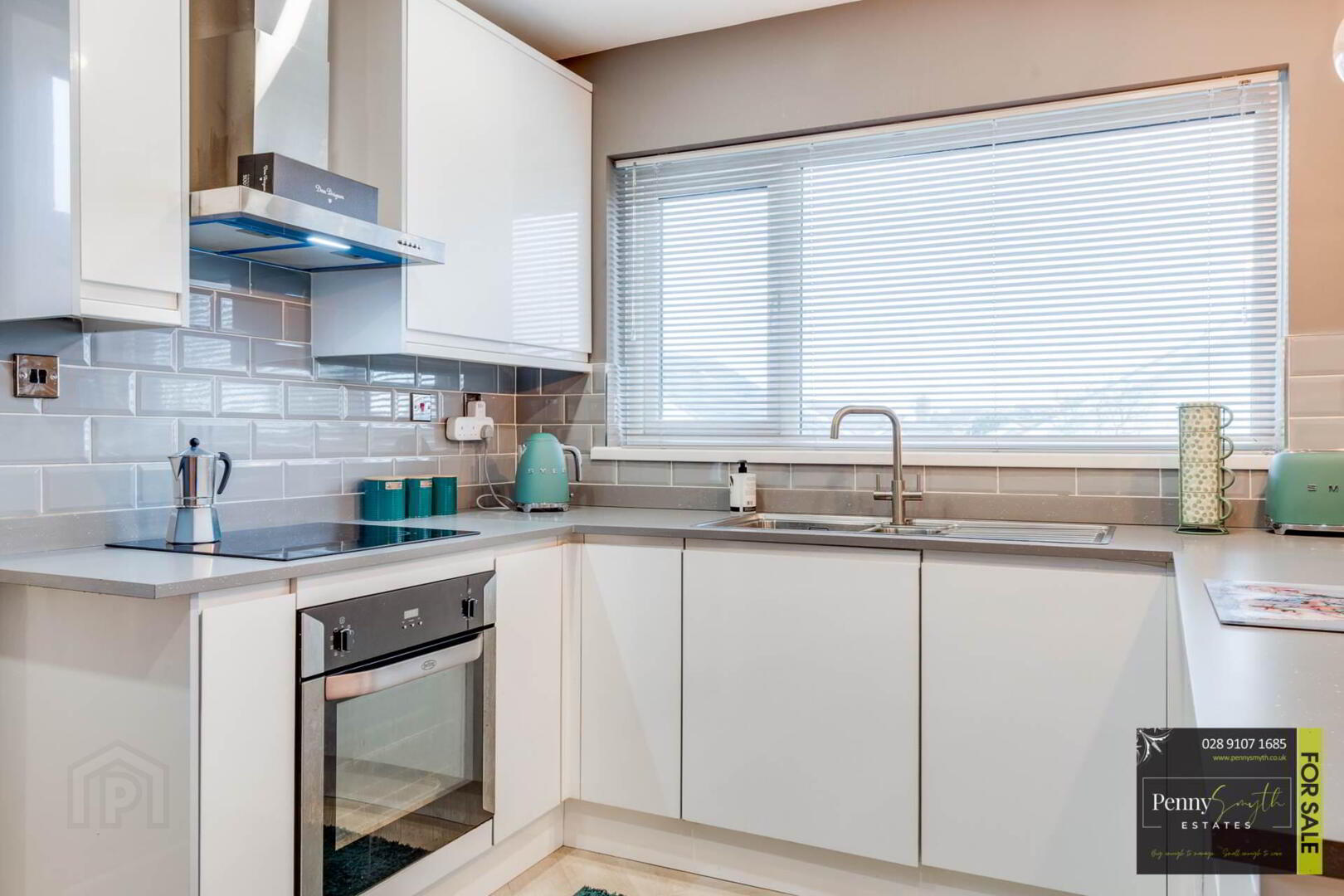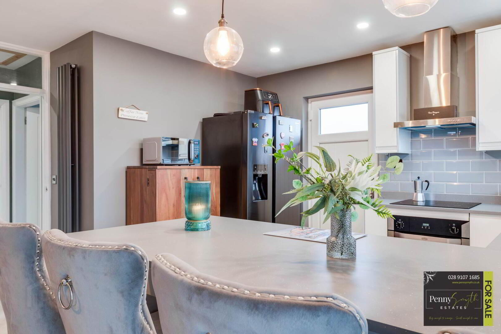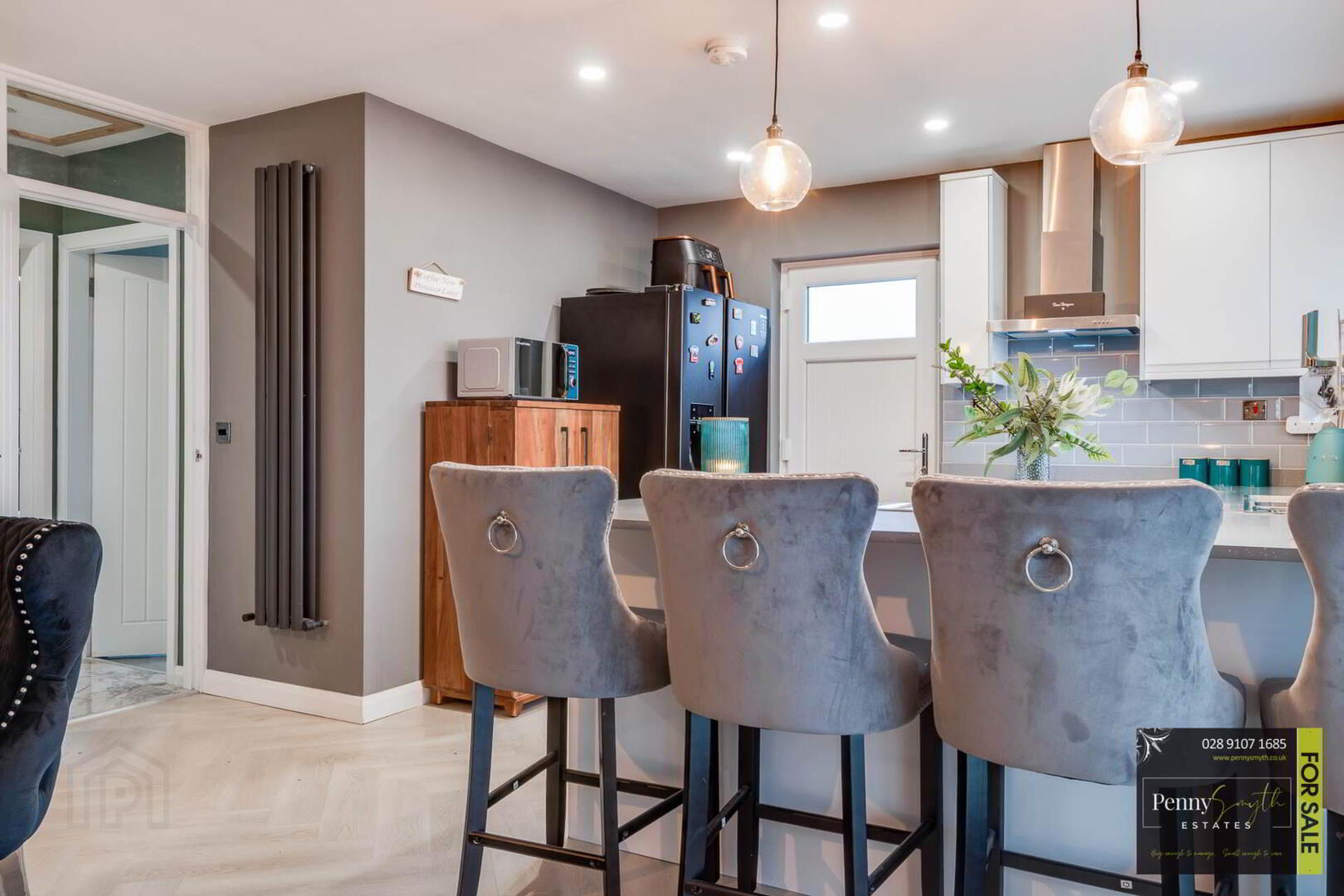 Range of high & low level units with white high gloss fascia. 1½ bowl Stainless steel sink unit & side drainer. Integrated electric oven & four ring ceramic hob & stainless steel extractor canopy over. Recess for American style fridge freezer. uPVC triple glazed windows & uPVC triple glazed external rear door. Recessed lighting, walls tiled at units, vertical anthracite radiators & Herringbone style laminate wood flooring.