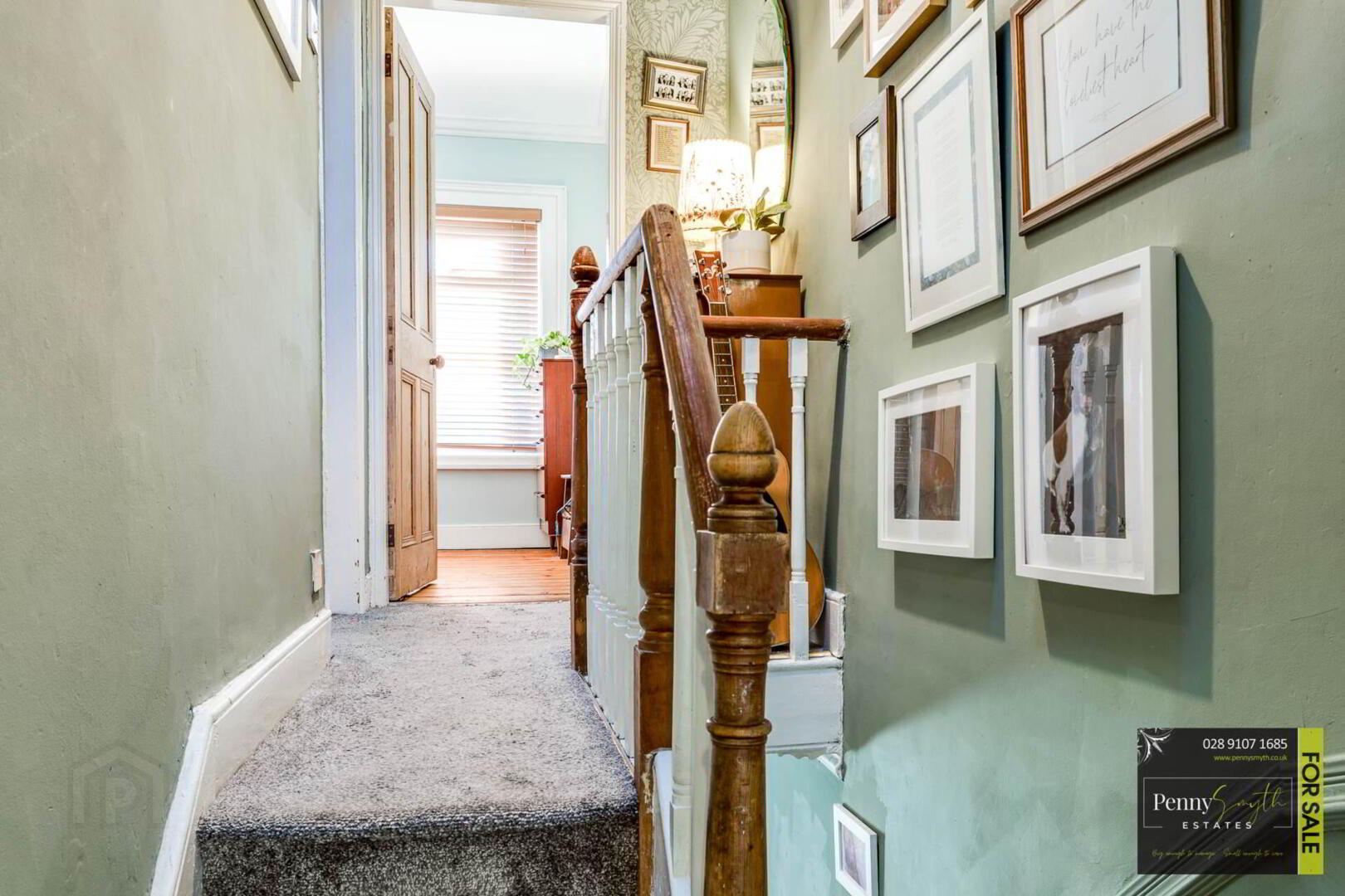 Roof window, Balustrade banister, carpeted stairs & access to roof space.
