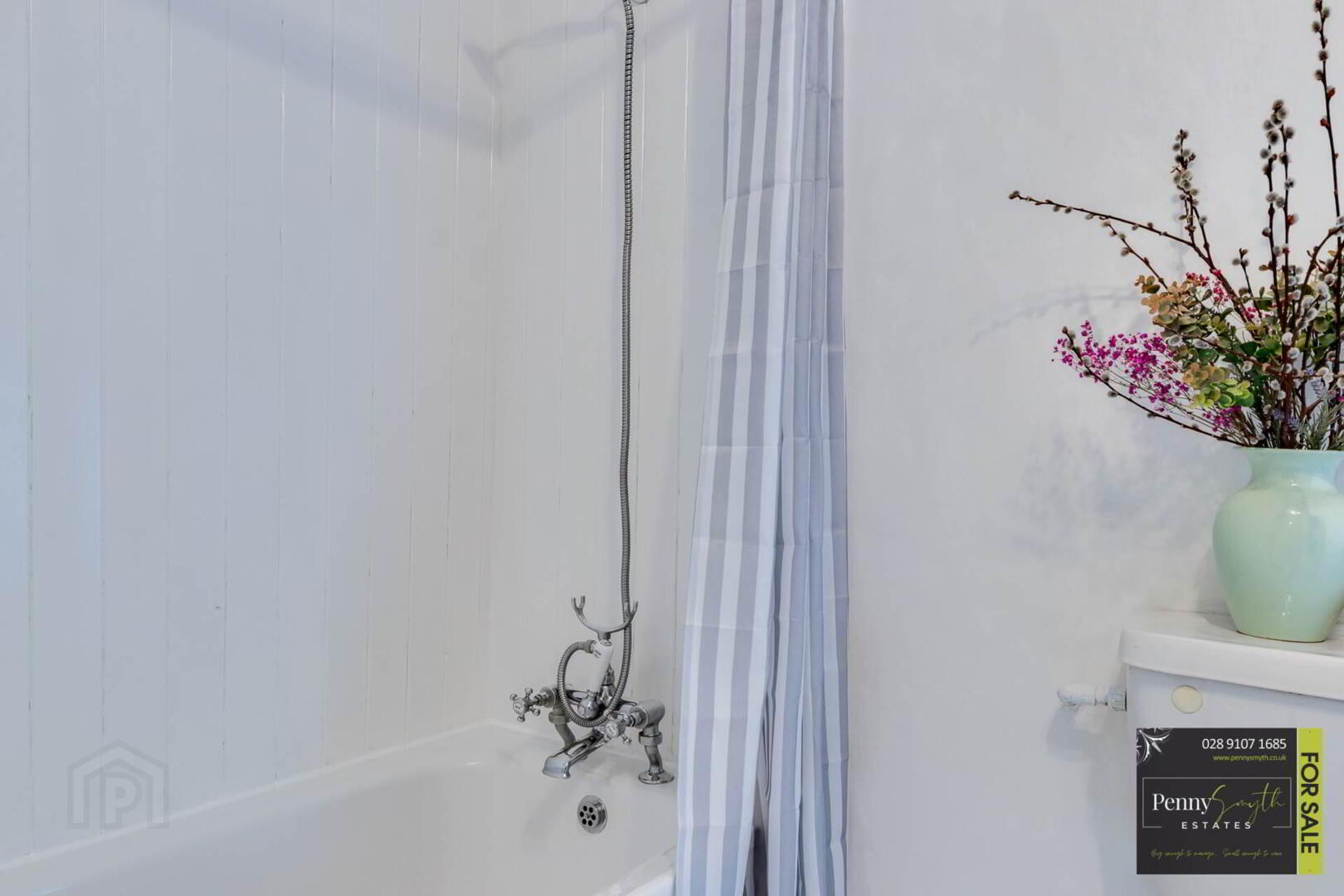 Three piece white suite comprising panelled bath with Verona bath shower mixer tap & mounted hand held shower. Pedestal wash hand basin with pillar taps & low flush w.c. Hot press with lagged hot water cylinder & airing shelves. uPVC double glazed privacy window, double radiator with thermostatic valve & painted solid wood flooring.