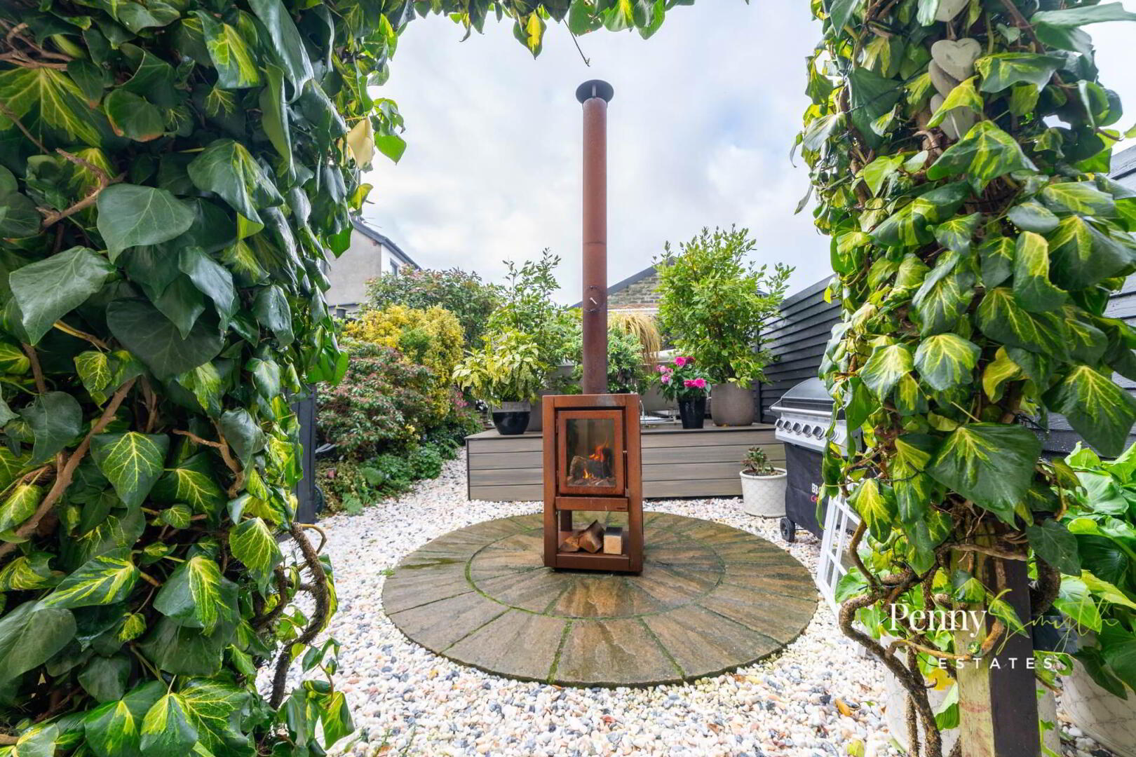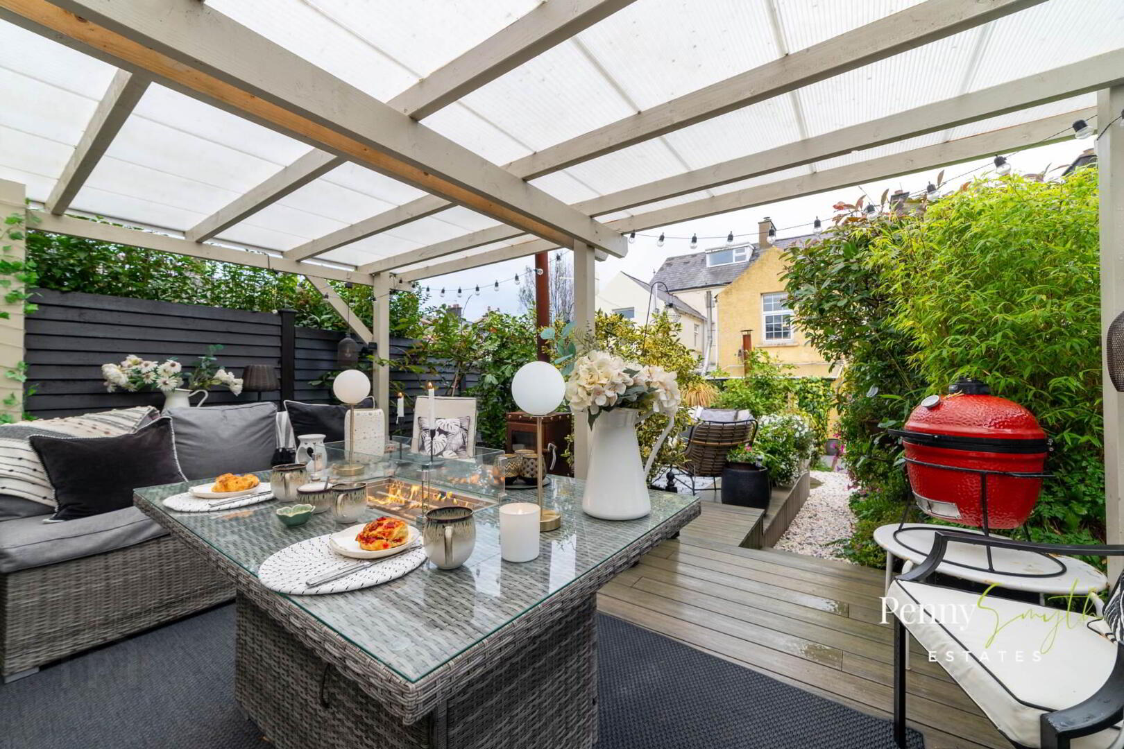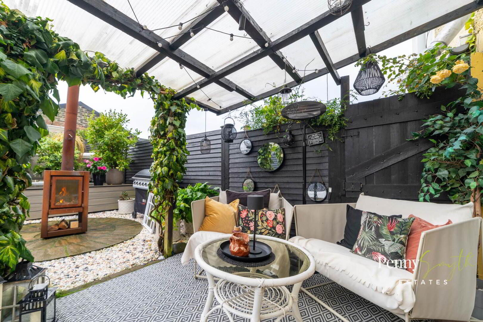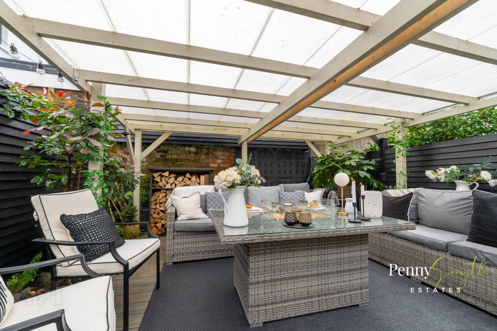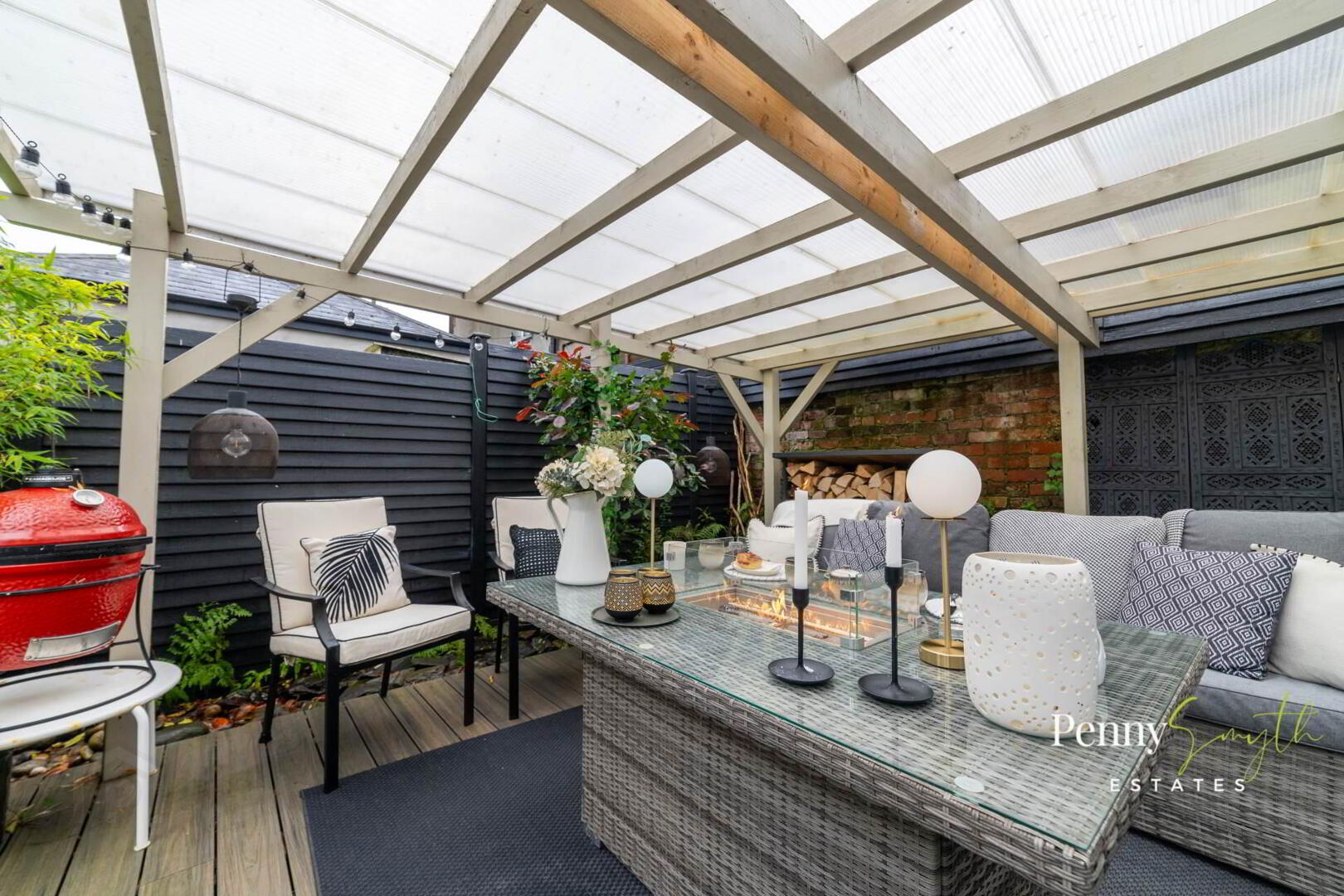 Private & enclosed south facing rear garden bordered by fencing, mature shrubs & trees. Beautifully landscaped to include raised Composite decked patio areas & covered Pergola. Outside water tap and outside light.