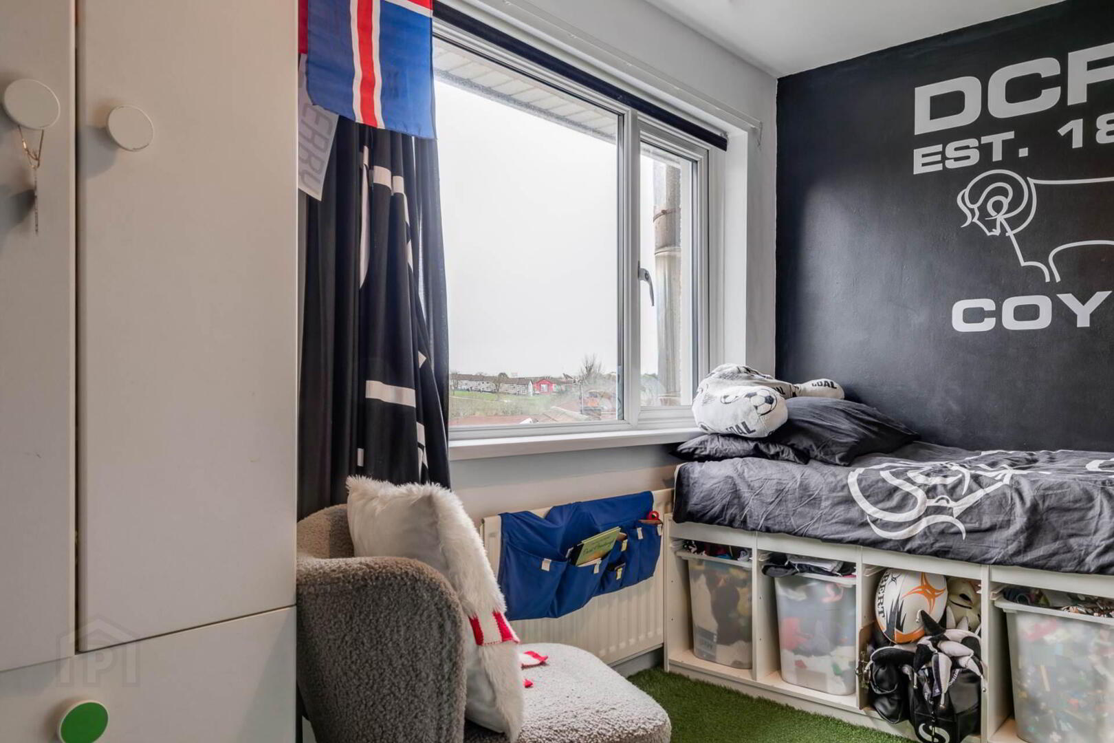 uPVC double glazed window, single radiator & artificial lawn flooring.