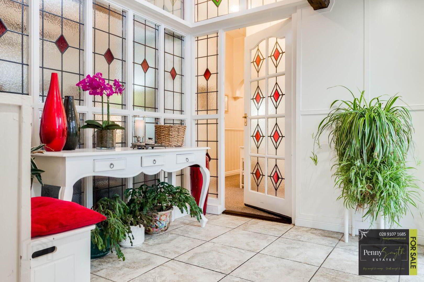 Timber external door with leaded stained glass side panels, leaded stained glass windows & ceramic tile flooring.