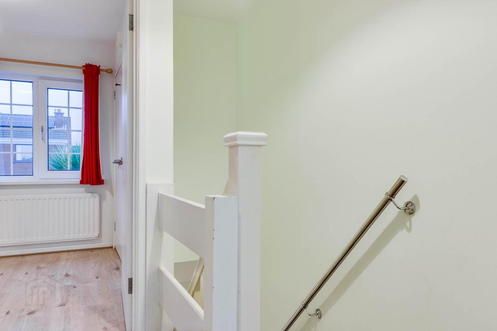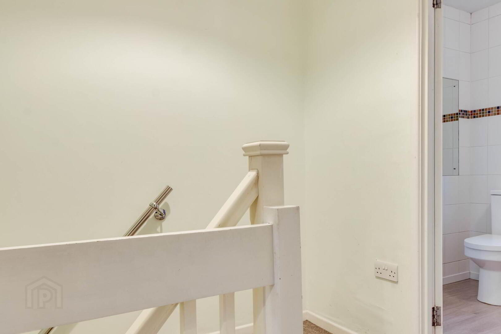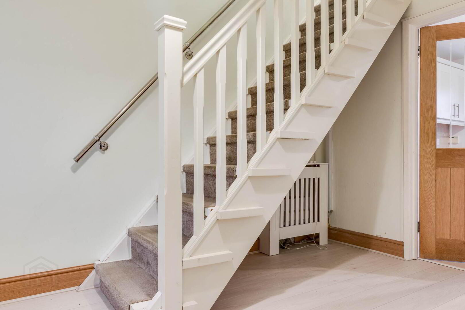 Wooden stairs with carpeted runner & mounted hand rail. Access to roof space & hot press with lagged copper hot water cylinder.