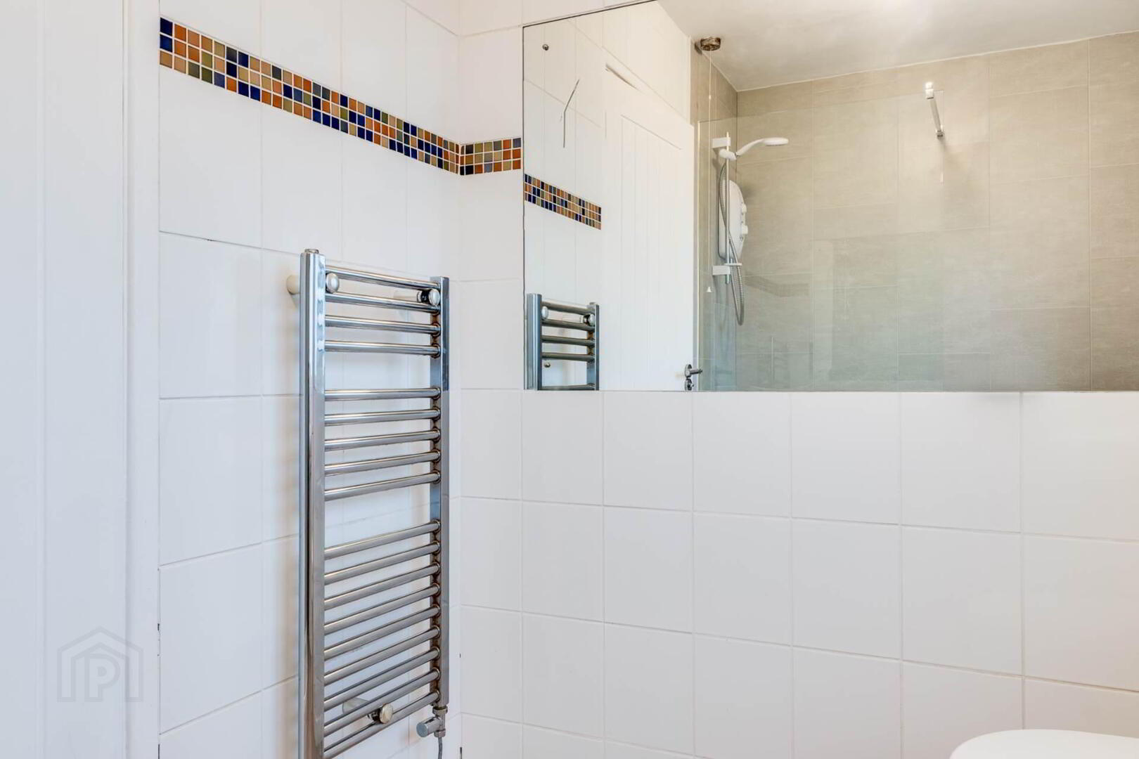 Three piece white suite comprising walk in shower with electric shower over. Semi pedestal wash hand basin with mixer tap & close couple w.c. uPVC double glazed privacy window, walls tiled & wet wall panelled. Heated towel radiator & wood effect flooring.