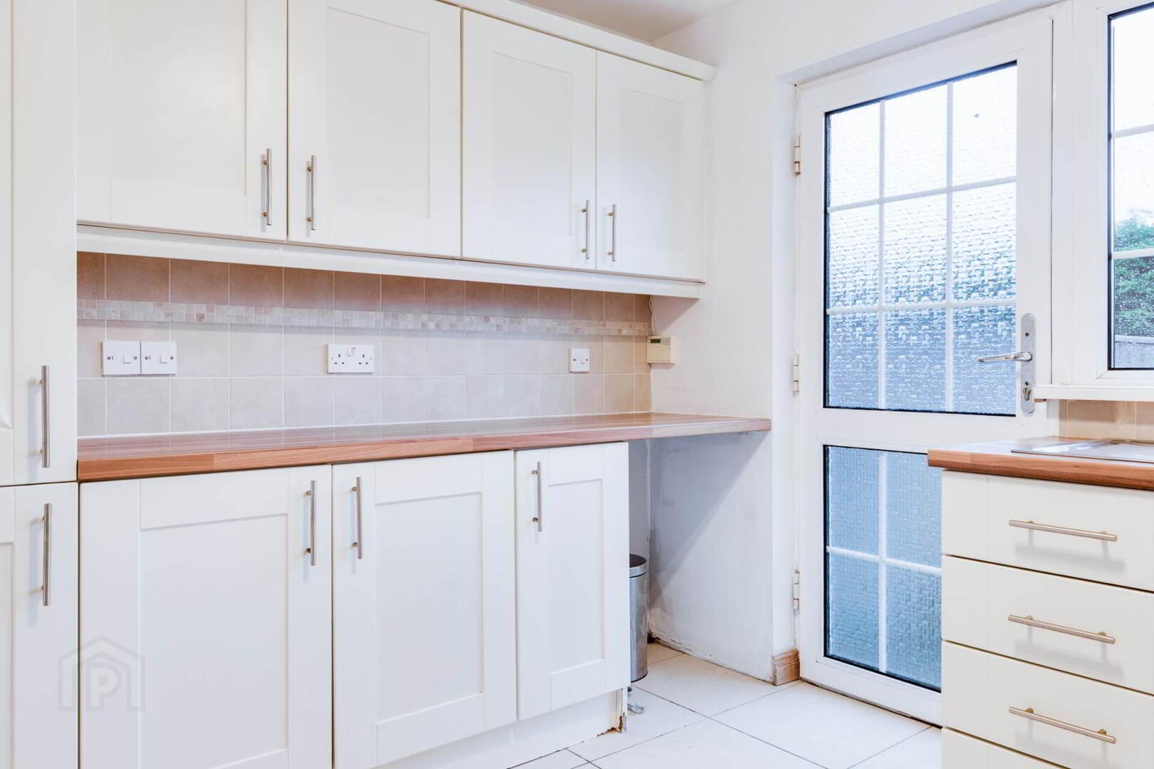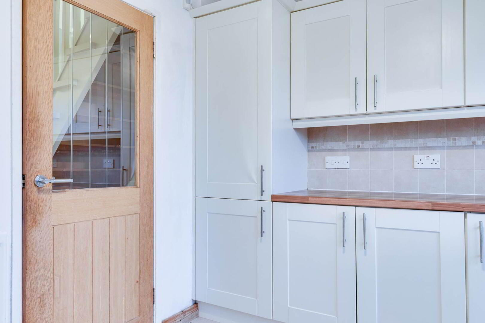 Range of high & low level units. 1½ bowl stainless steel sink unit with mixer tap. Integrated electric oven & ceramic hob with stainless steel extractor hood. Integrated fridge freezer & recess with plumbing for washing machine. uPVC double glazed window & external door. Walls tiled at units, double radiator & ceramic tiled flooring.