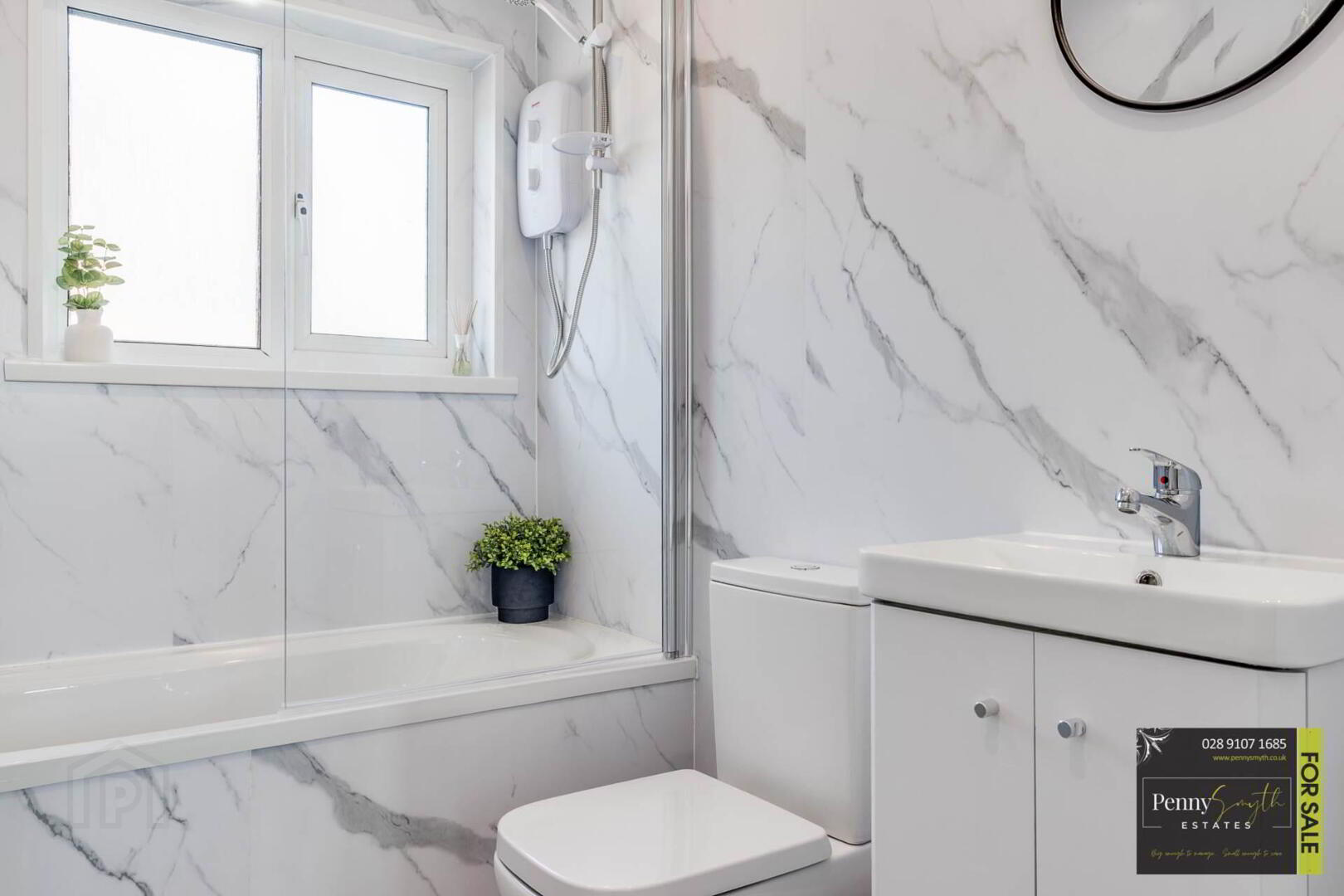 Three piece white suite comprising panelled bath with mixer tap & electric shower over. Vanity sink unit with mixer tap & close couple w.c. uPVC double glazed frosted window, extractor fan, recessed lighting, heated towel radiator & Vinyl flooring.
